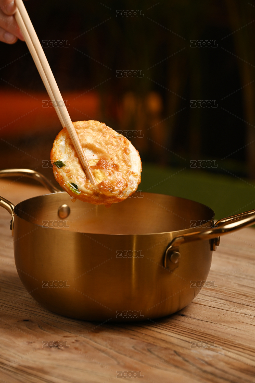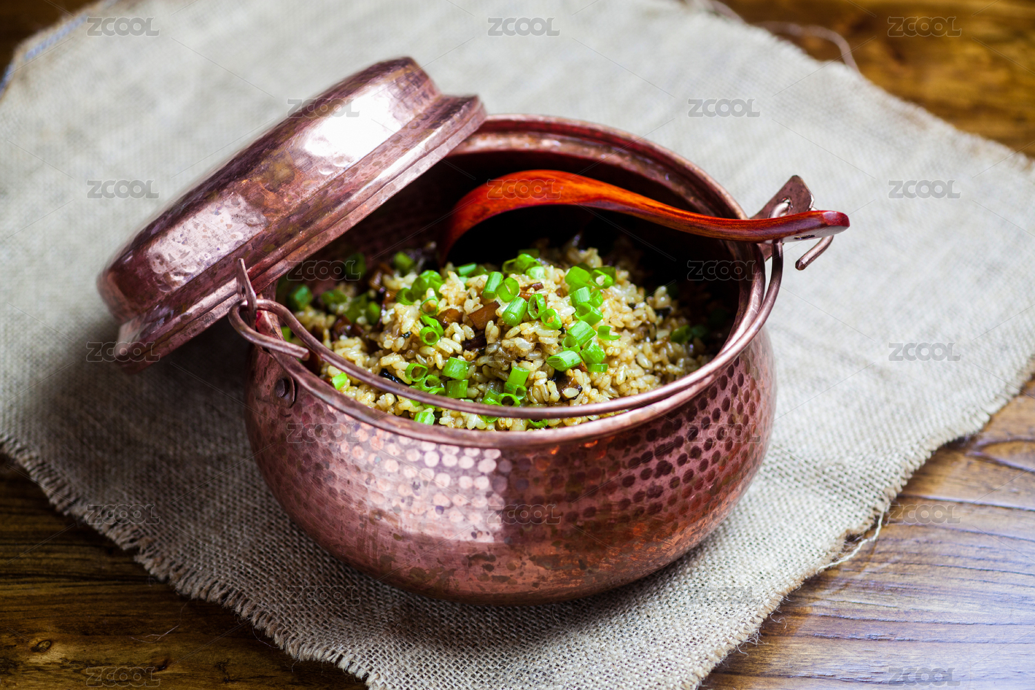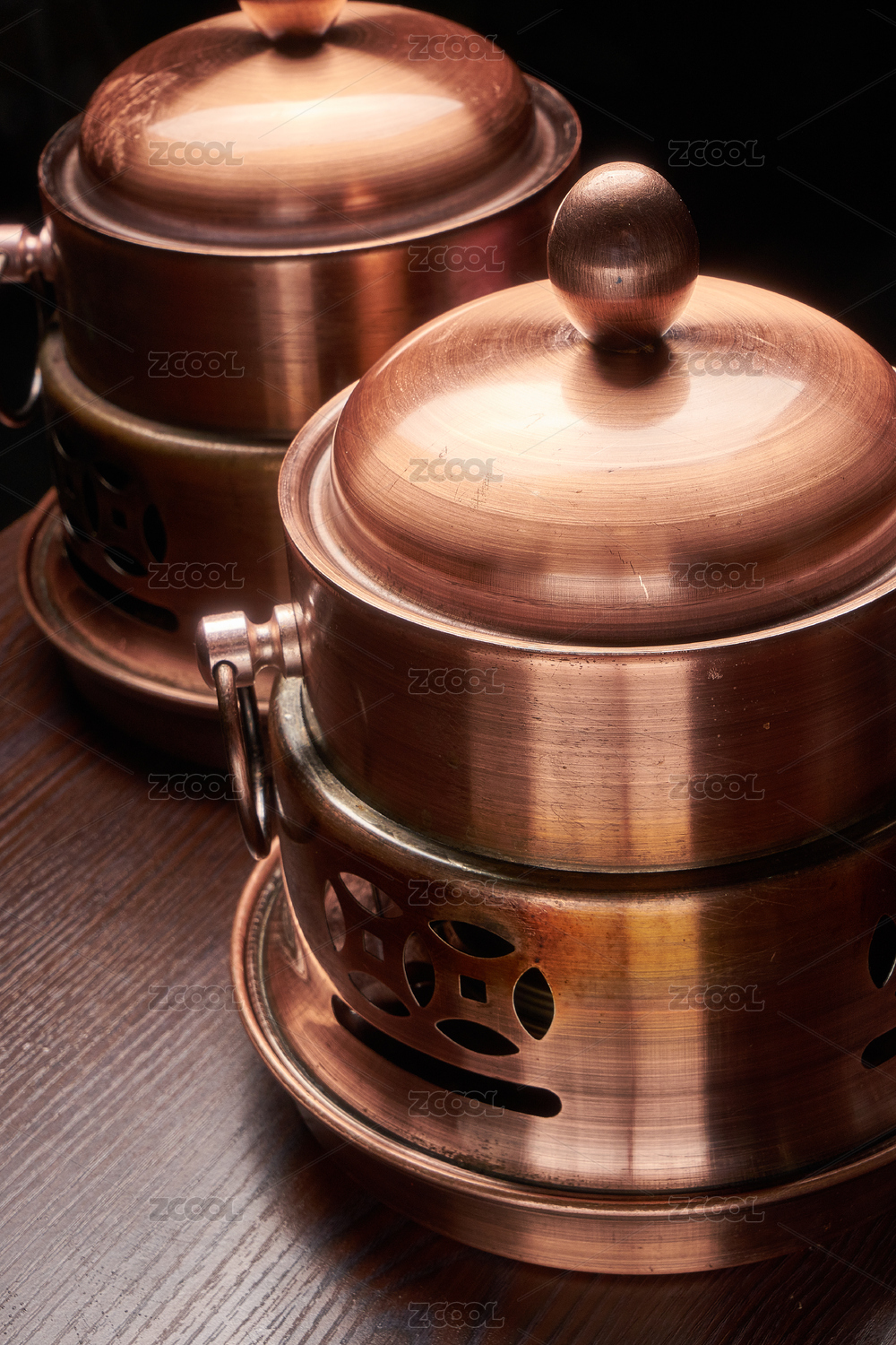 復(fù)古的銅鍋放在木桌上面