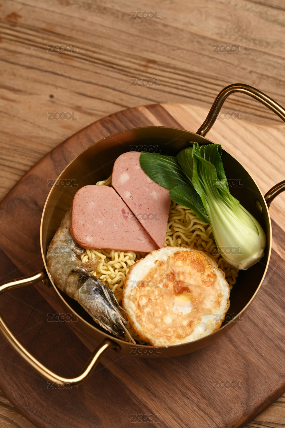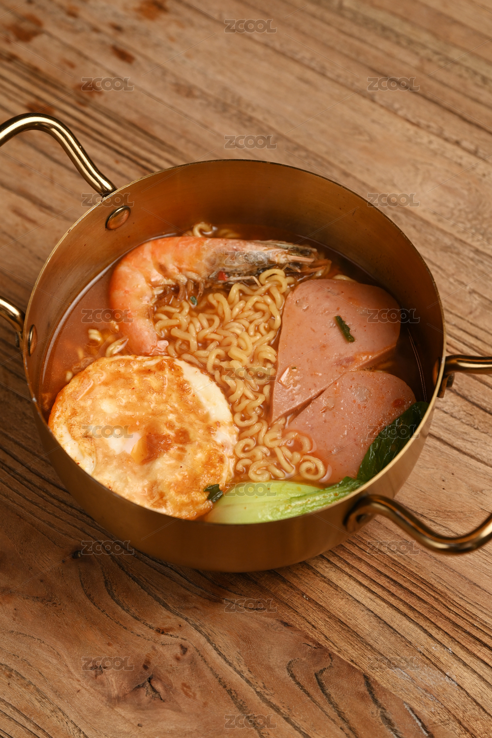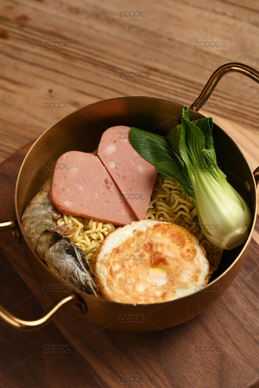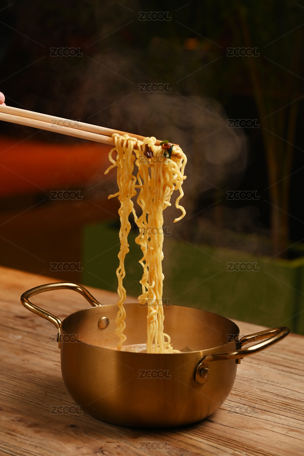 復(fù)古的銅鍋放在木桌上面