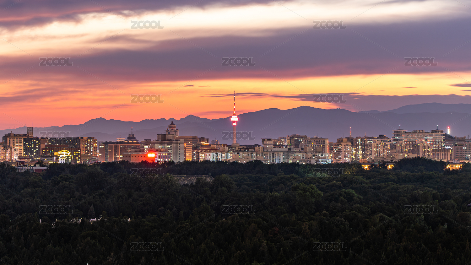 夜晚中央電視塔晚霞城市燈光