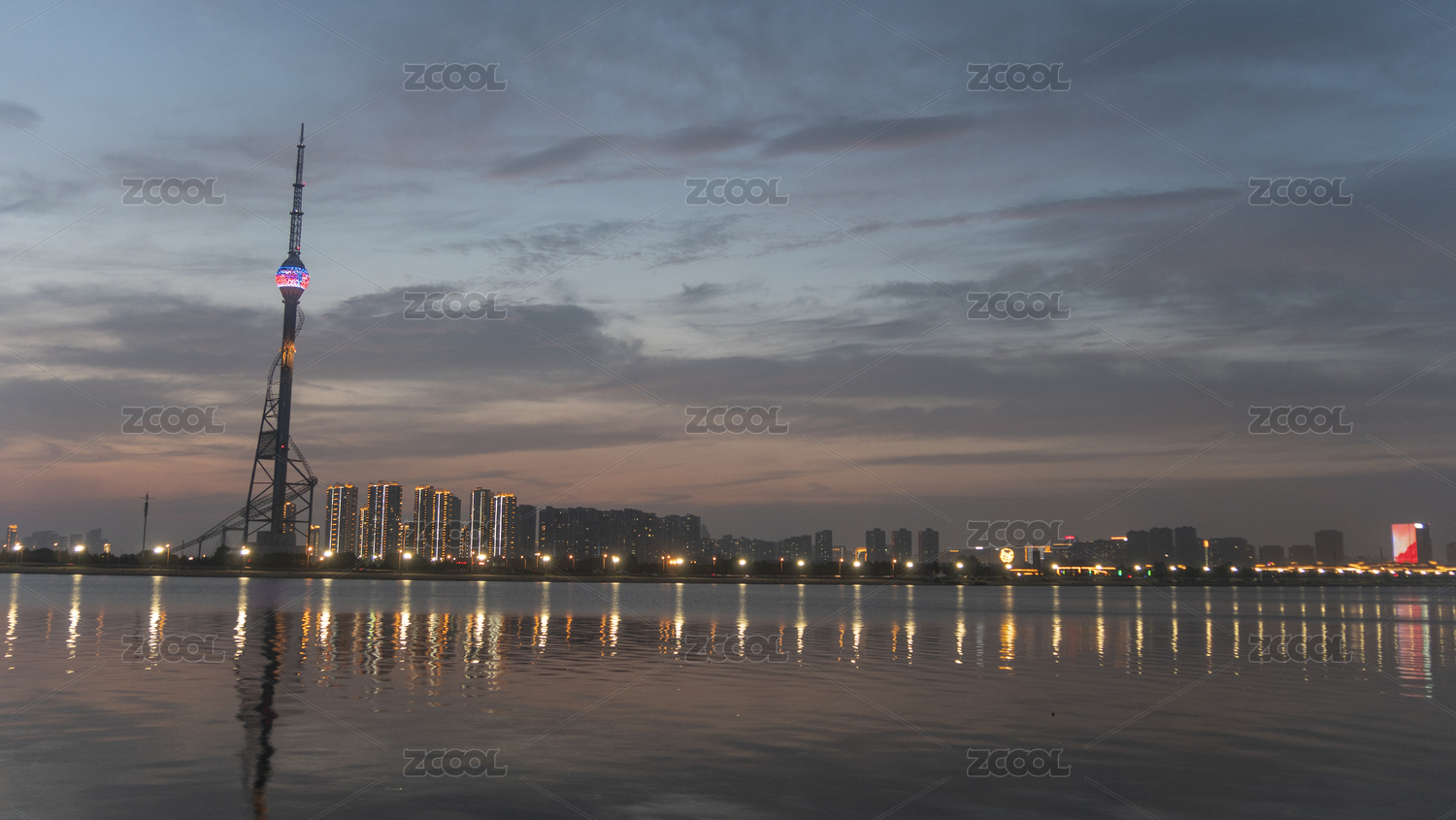 夏日山東臨沂沂河電視塔火燒云晚霞城市燈光