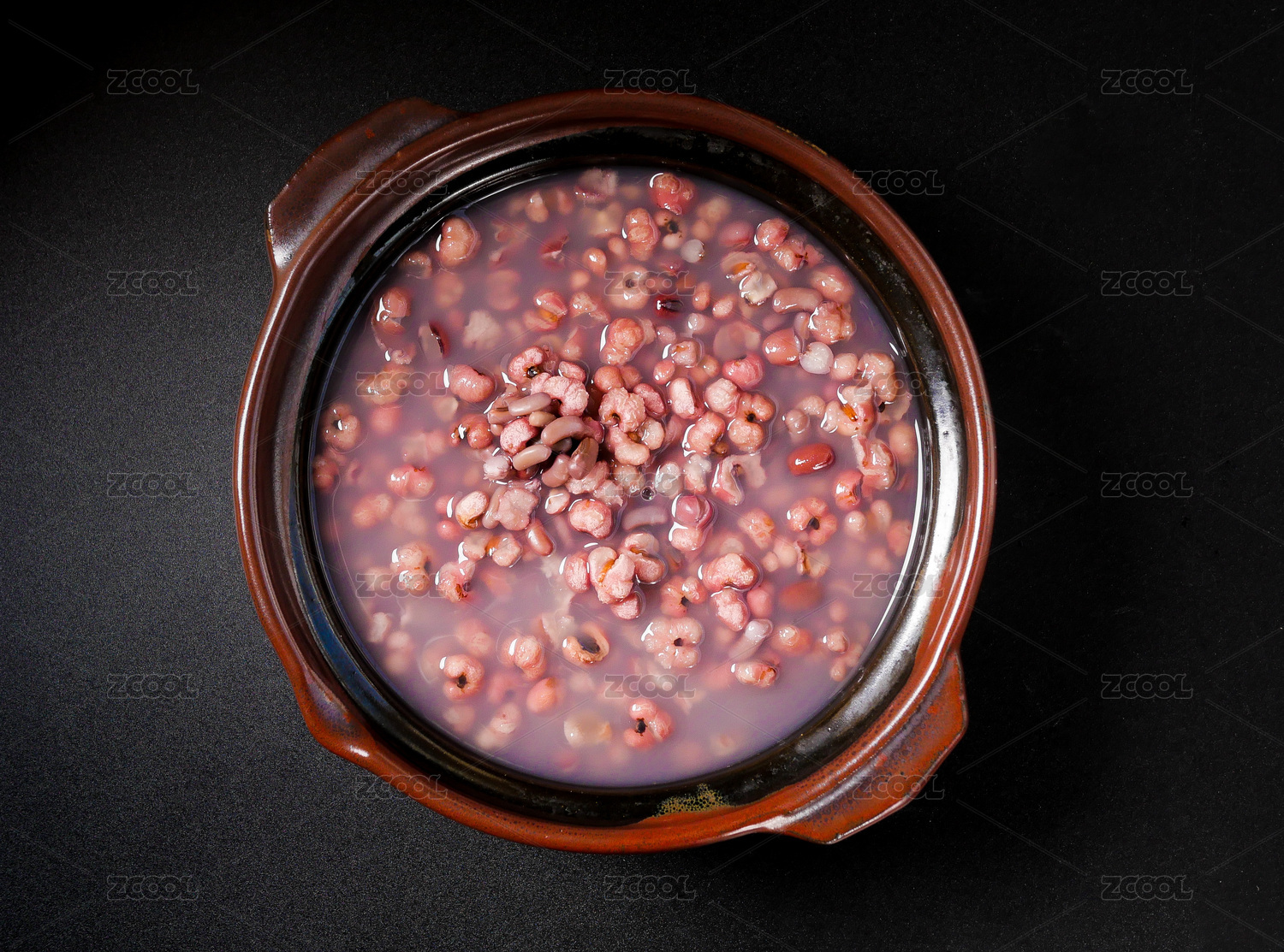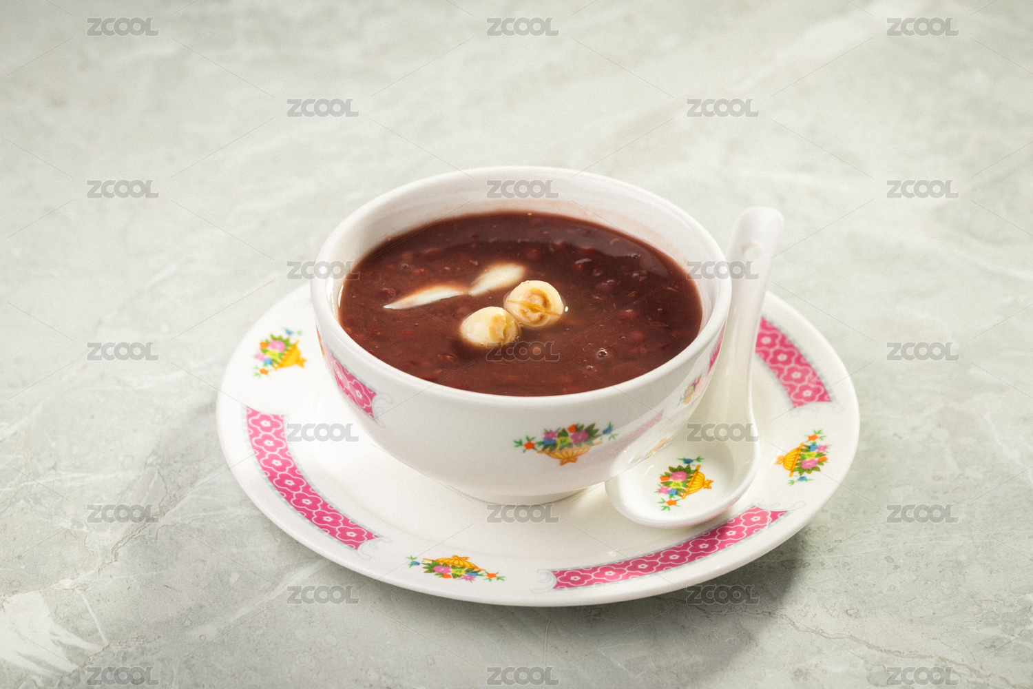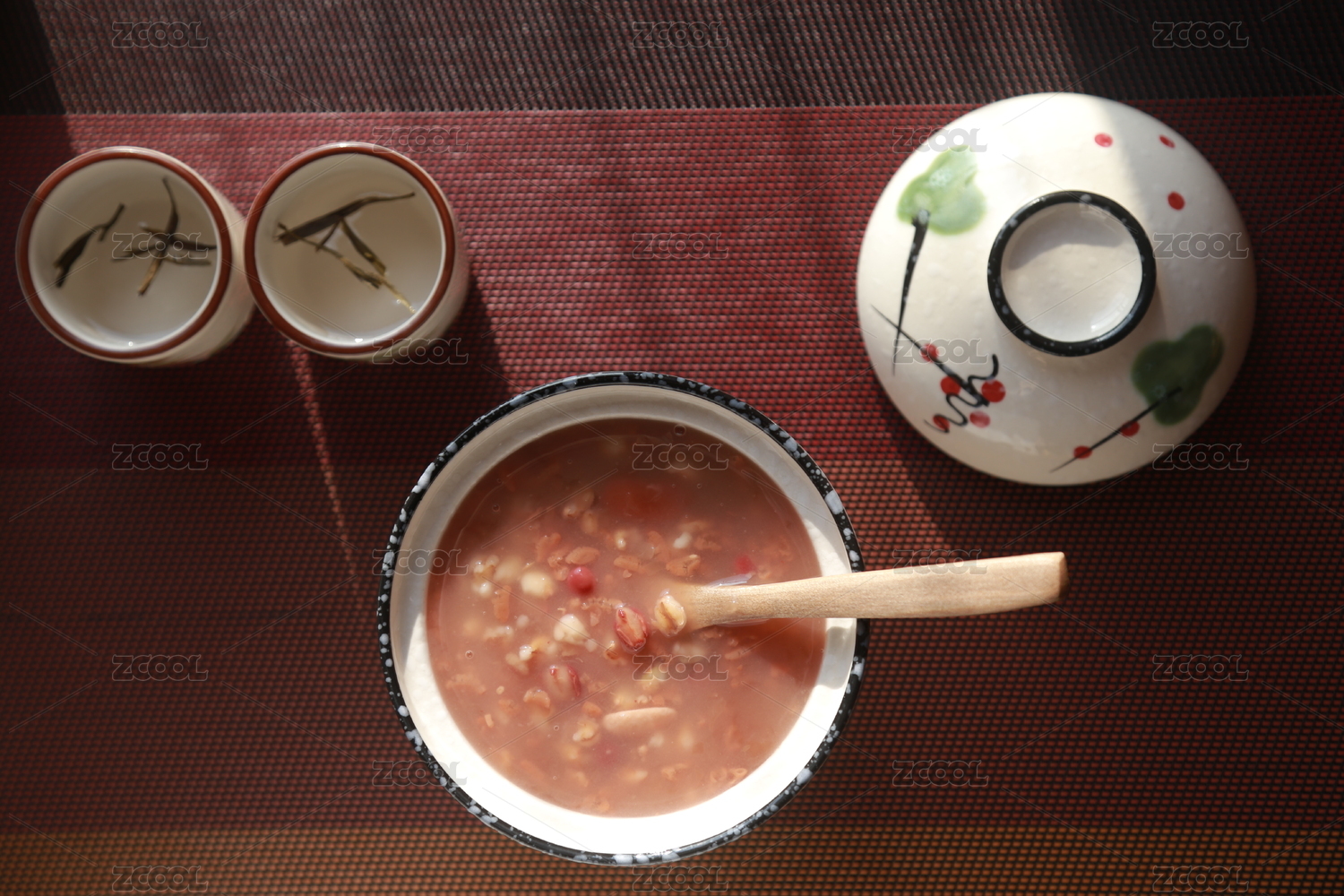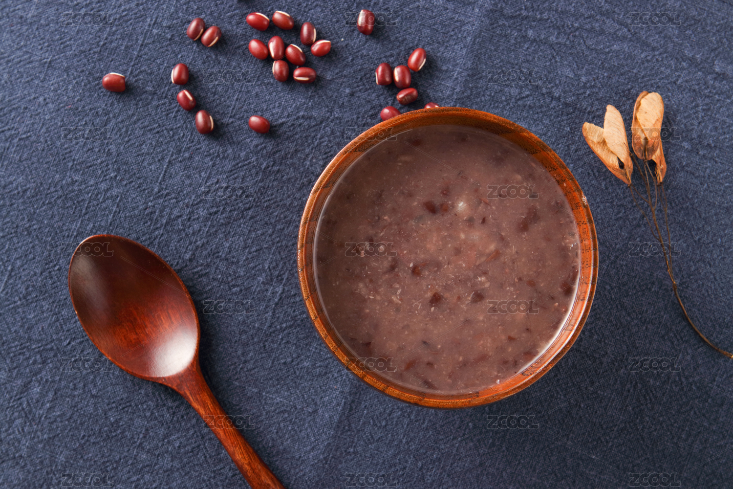 俯拍暗紅色餐墊上的淺色陶瓷碗中的紅豆粥