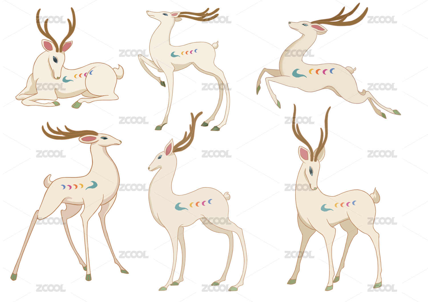 九色鹿各姿態(tài)動作集合白色背景國風插畫素材