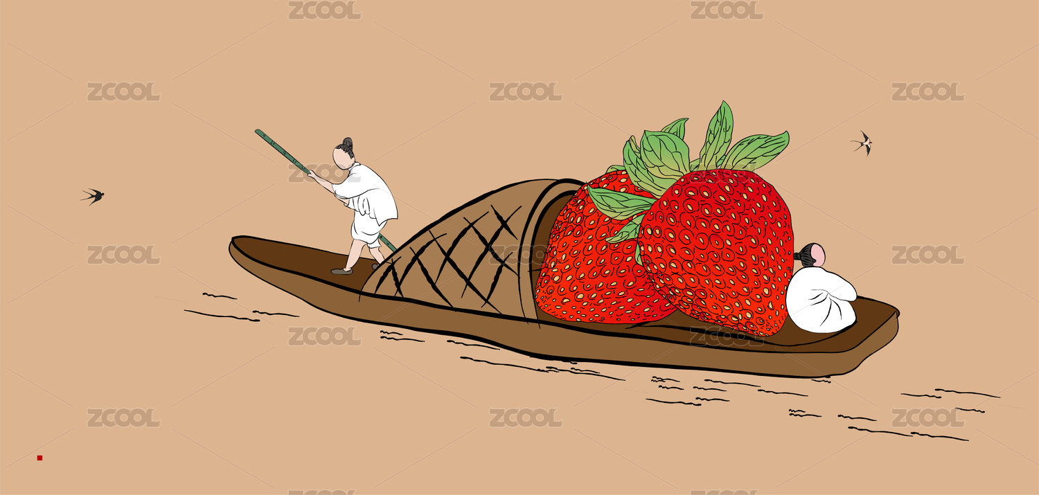 國潮古人船運輸草莓微景矢量中國風插畫素材