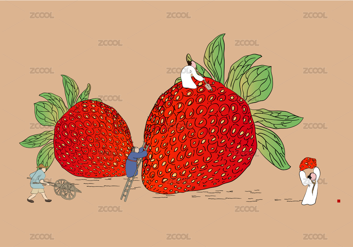國潮古人采摘草莓微景矢量中國風插畫素材