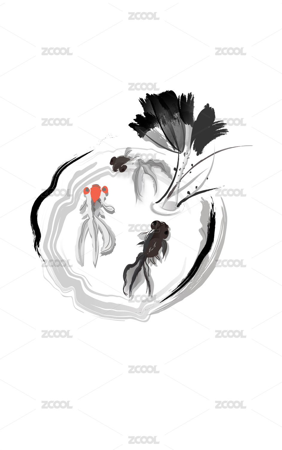 荷塘中的金魚矢量水墨中國風插畫素材