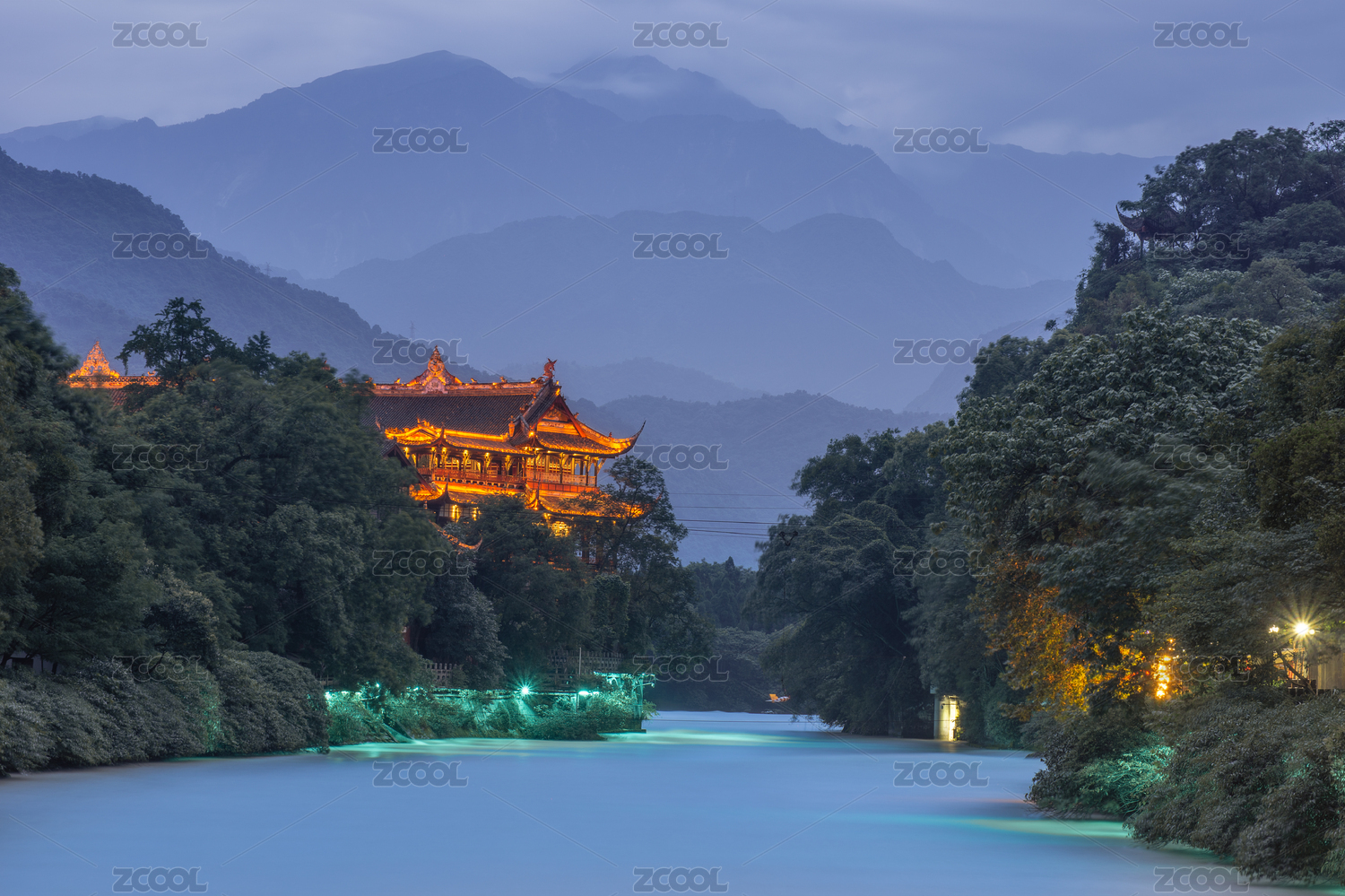 傍晚群山背景冷色調(diào)的四川成都都江堰景區(qū)寶瓶口伏龍觀夜景