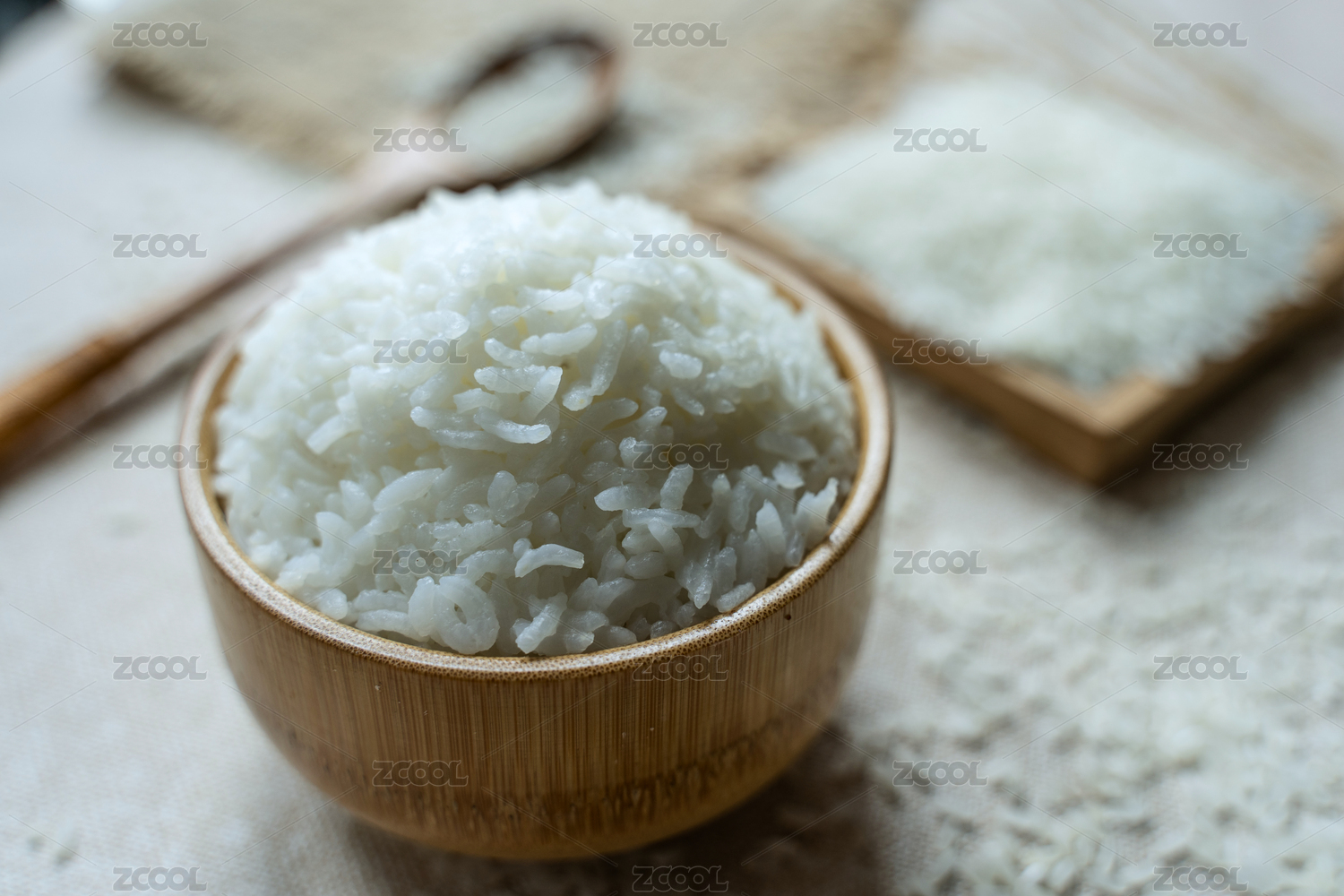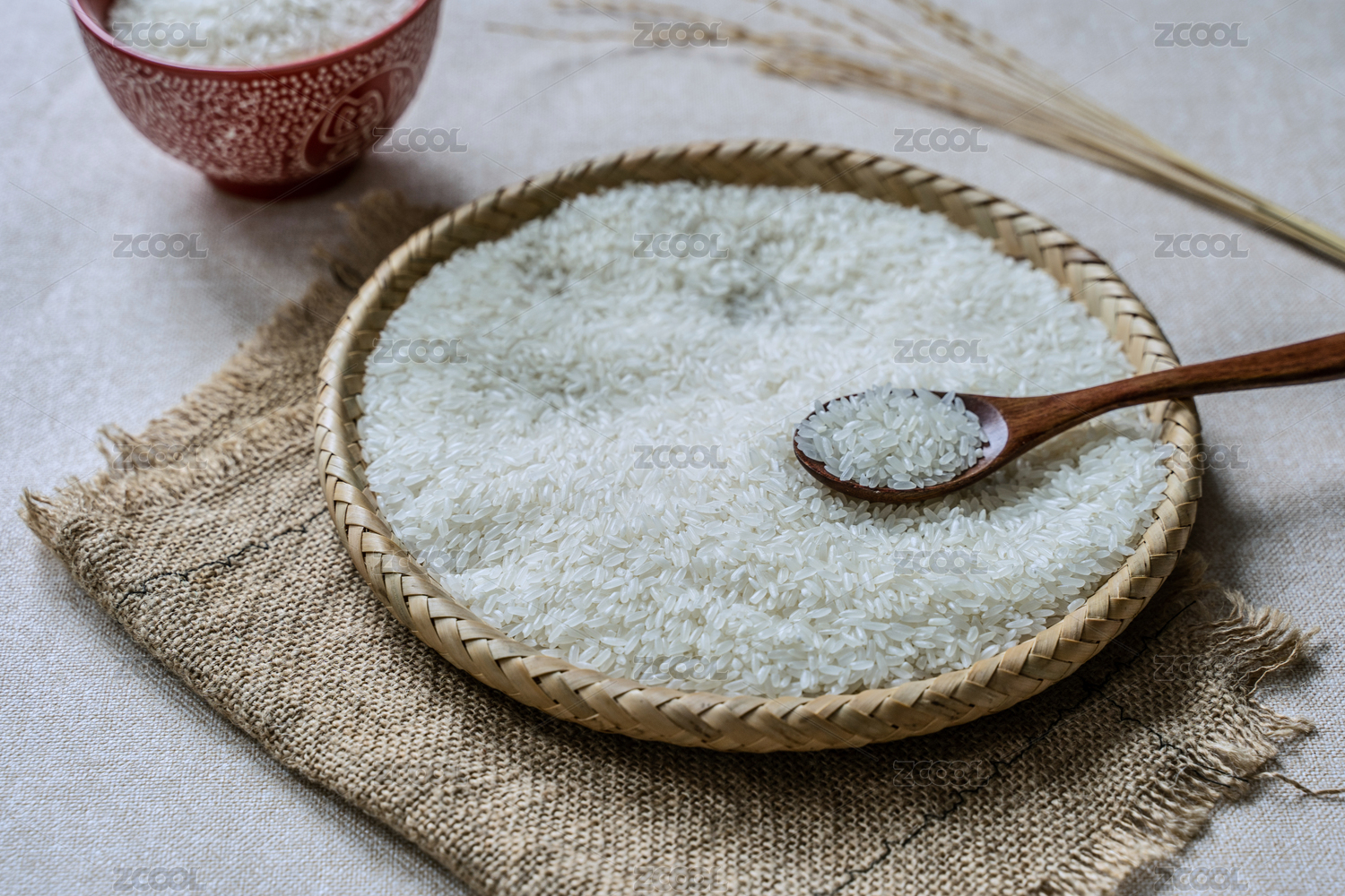 灰色冷色調(diào)背景下竹筐里的白米飯