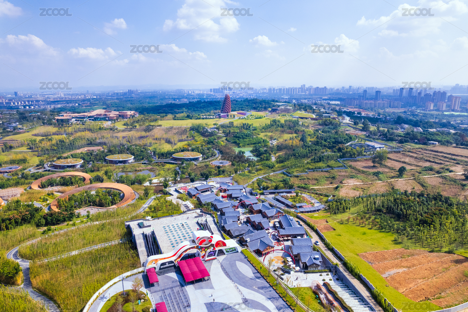 成都大熊貓繁育研究基地西門和熊貓塔航拍