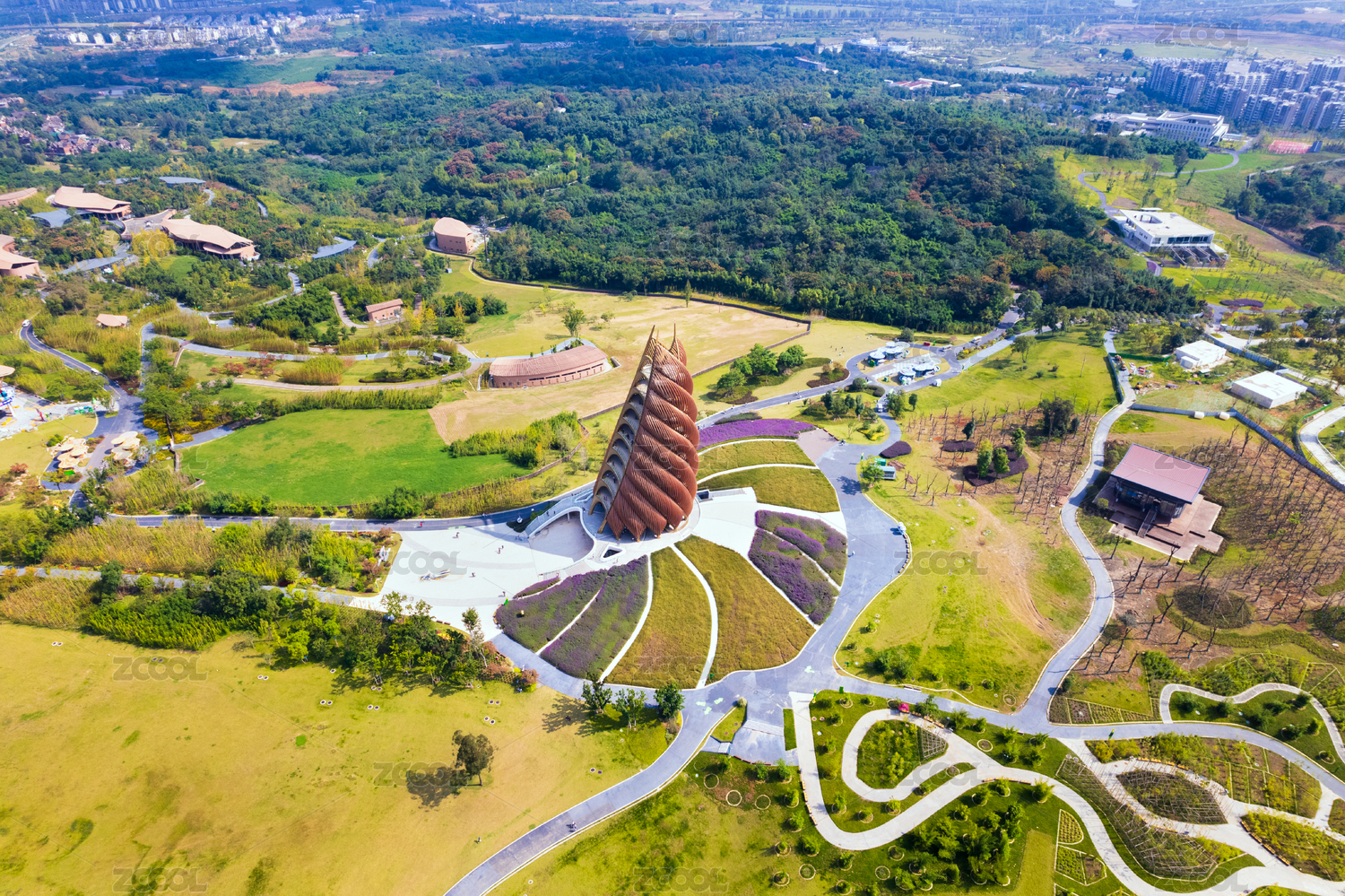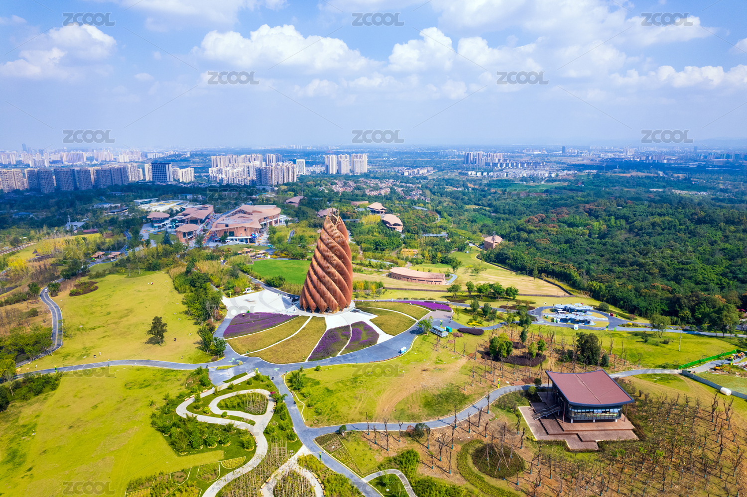 成都大熊貓繁育研究基地竹筍狀的熊貓塔航拍