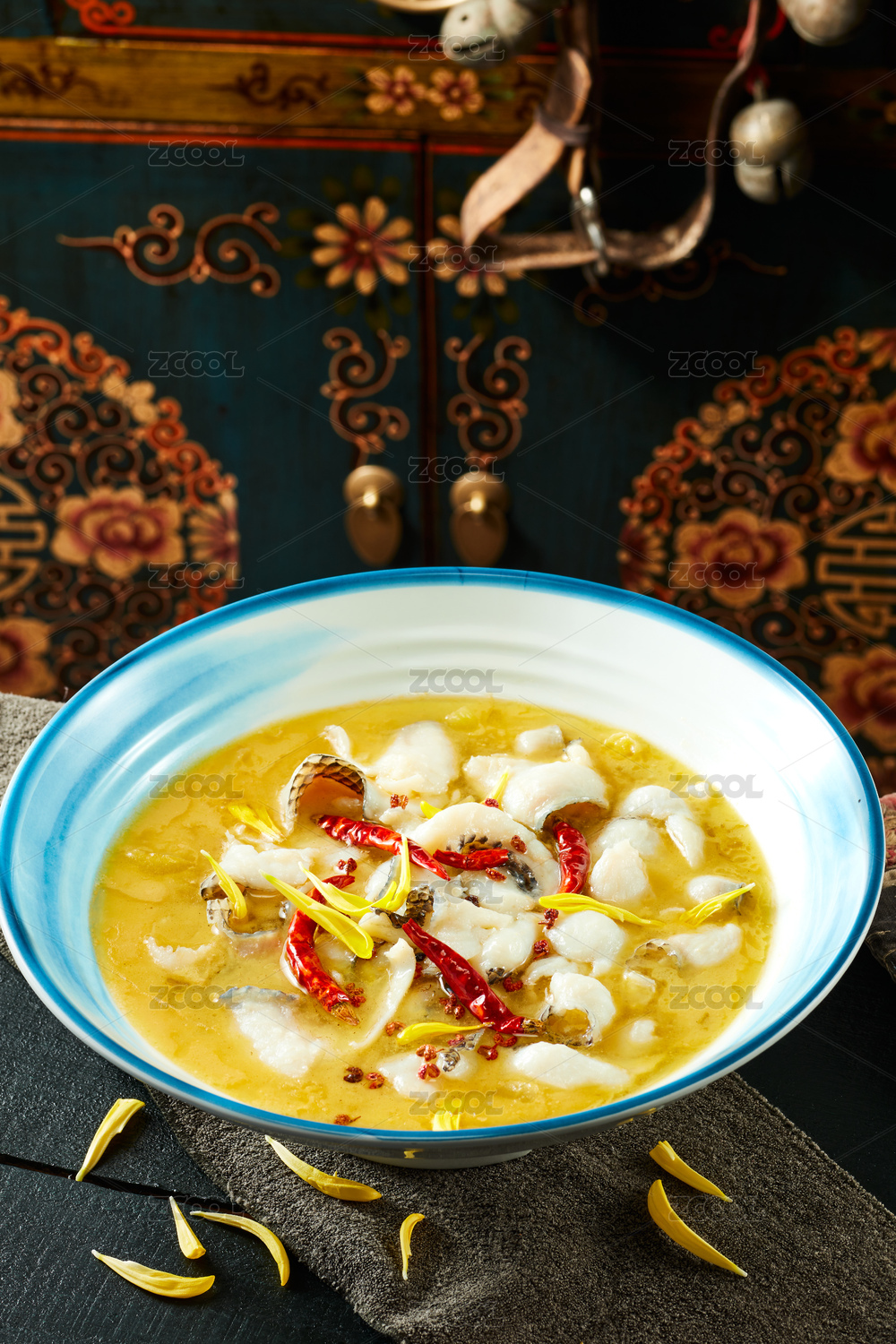 不銹鋼鍋里的川菜江湖菜麻辣金湯水煮魚片