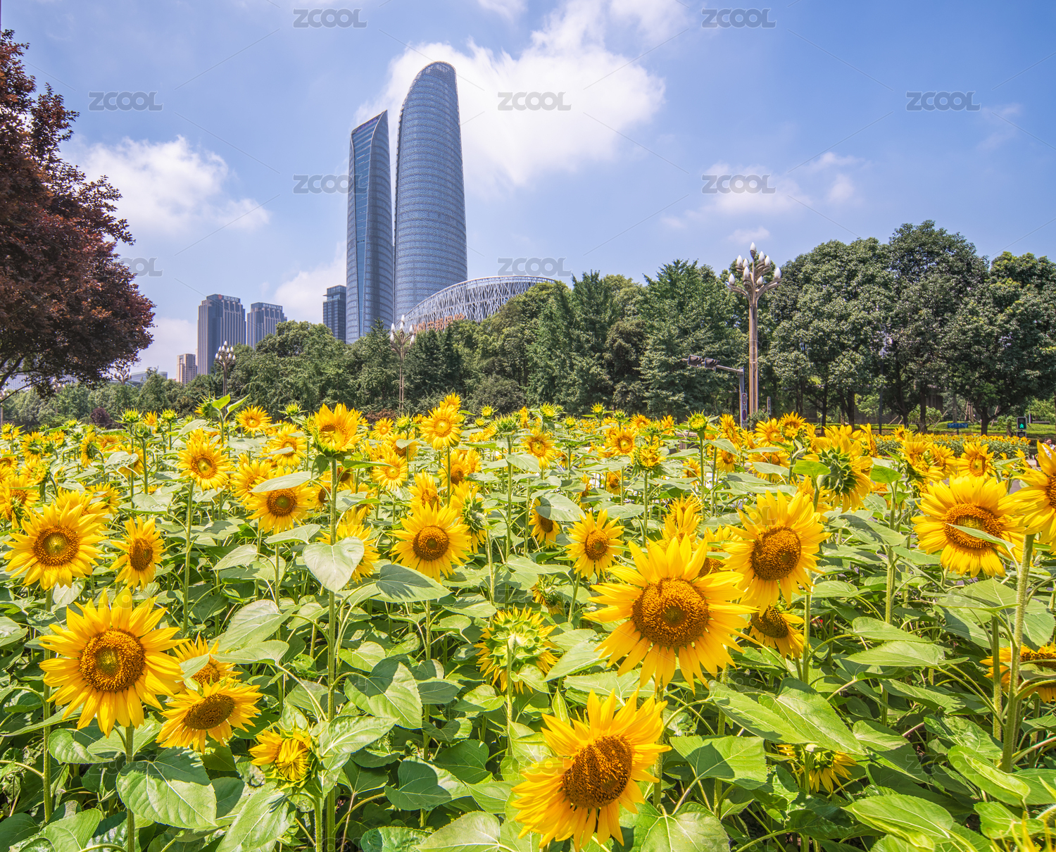 中國四川成都高新南區(qū)人民南路南延線道路邊盛開的向日葵與現(xiàn)代建筑