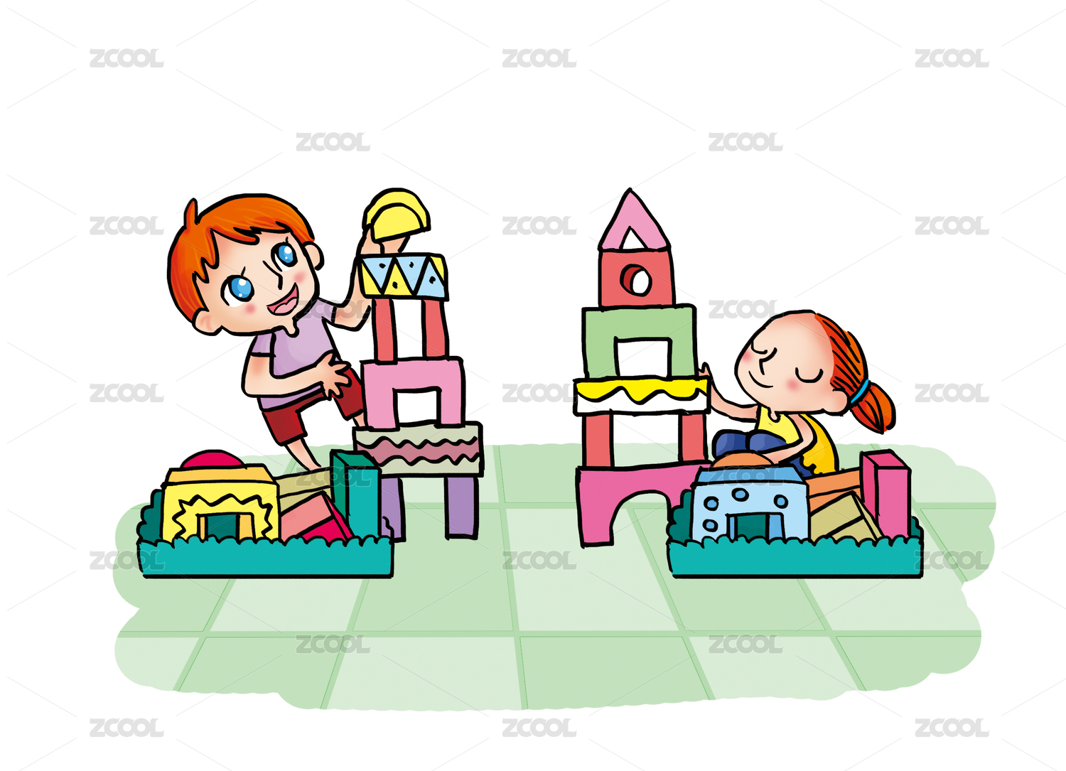一個小男孩和一個小女孩各自在搭建積木城堡