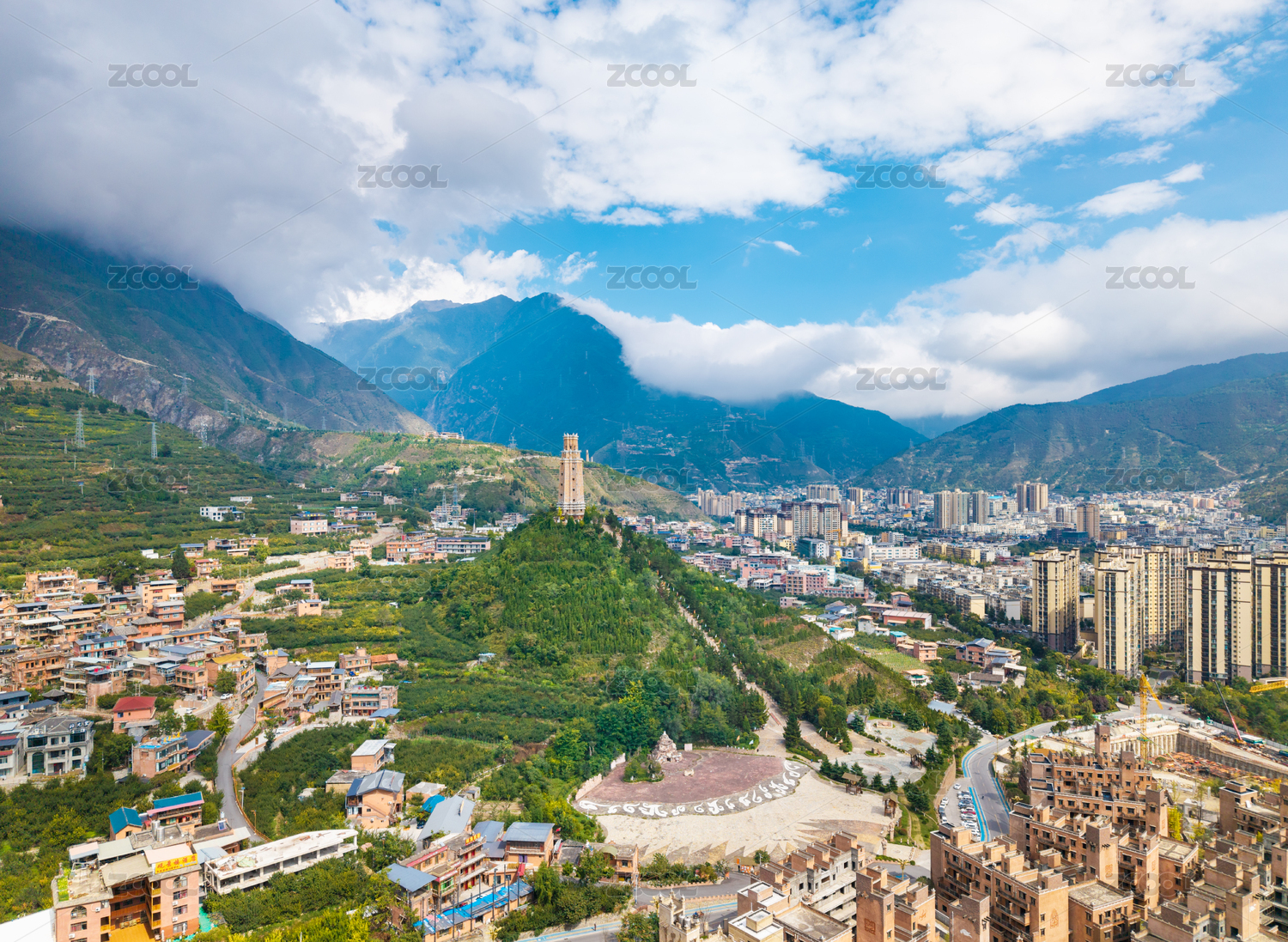 四川阿壩茂縣中國古羌城木比塔城市風光航拍