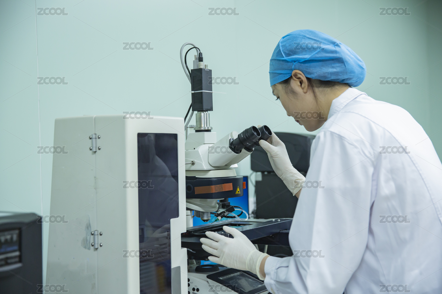 醫(yī)學實驗室里看顯微鏡的女醫(yī)生