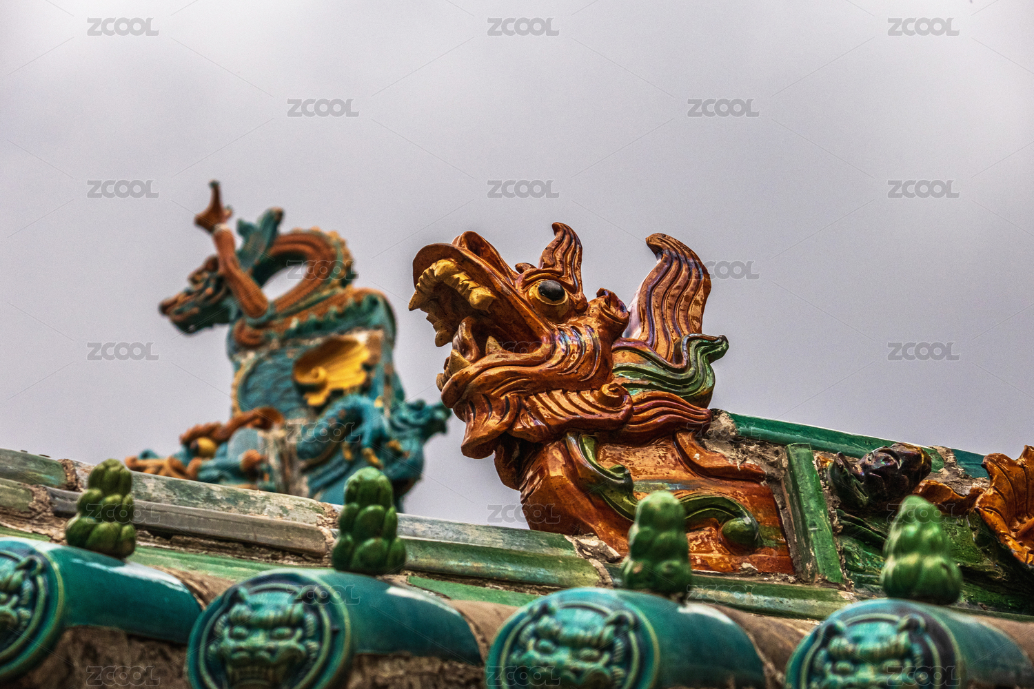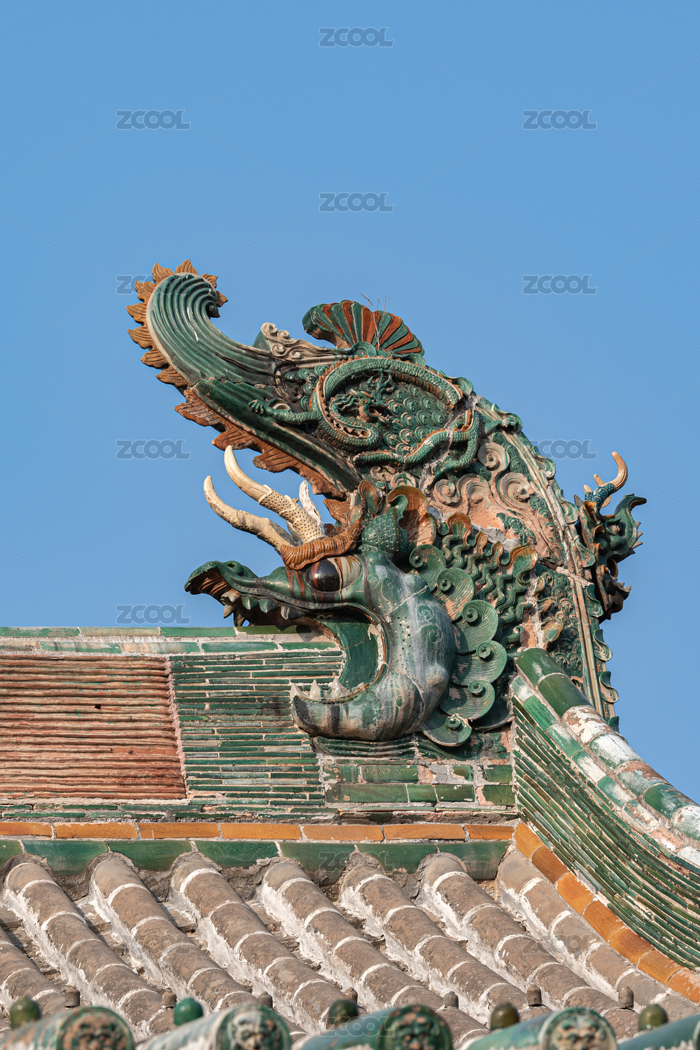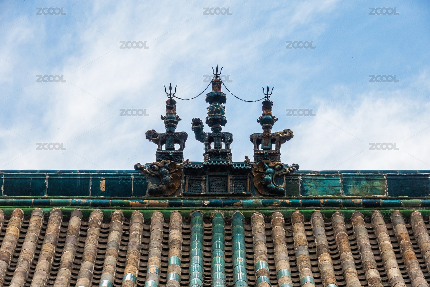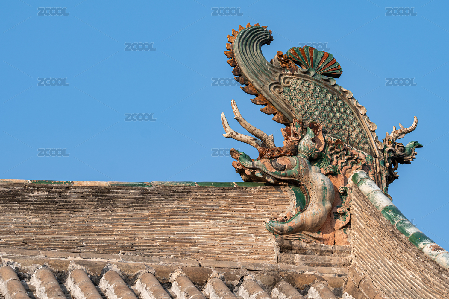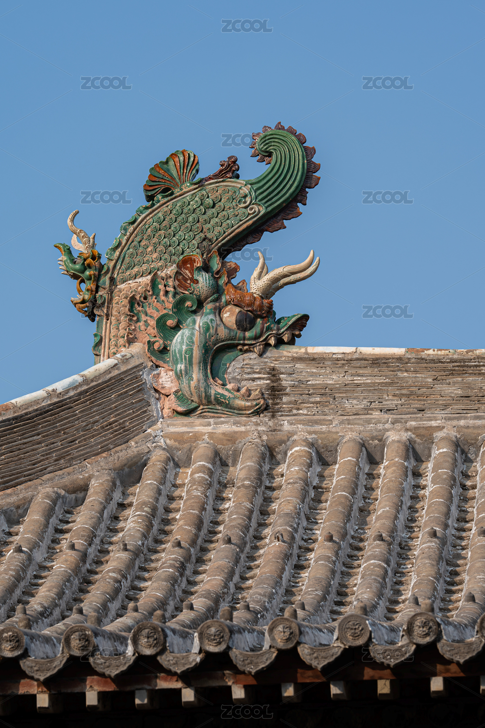 古代建筑屋脊雕塑琉璃,天空背景歷史文物屋