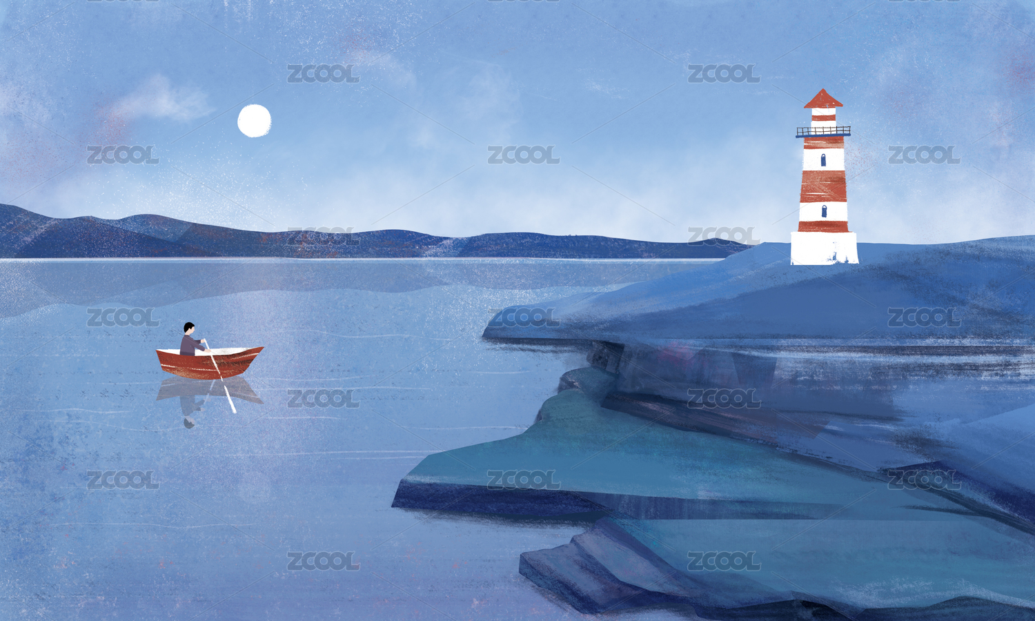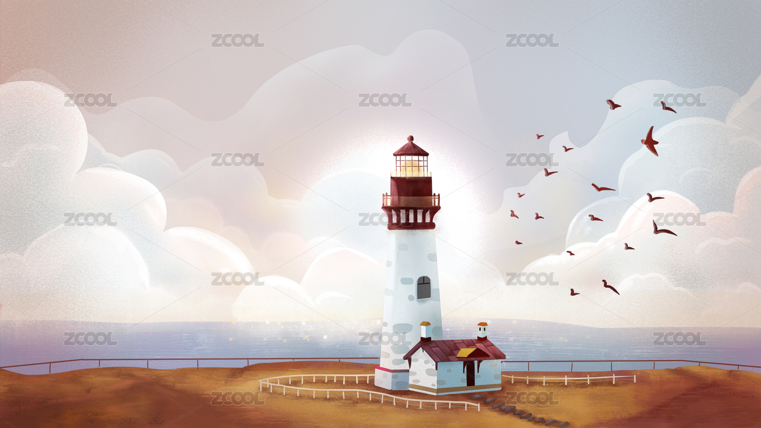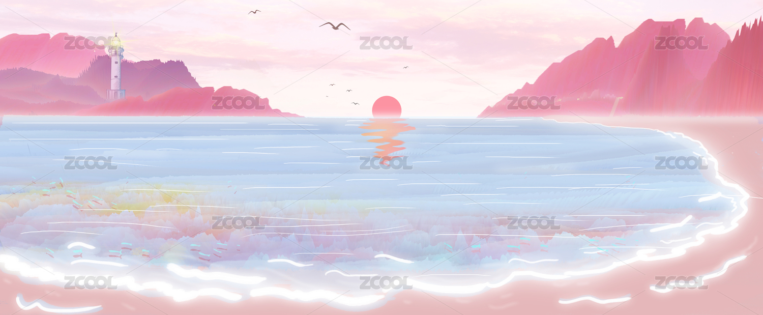 太陽從海邊升起,燈塔照耀著遠方指引方向,浪花拍打柔軟的沙灘插畫