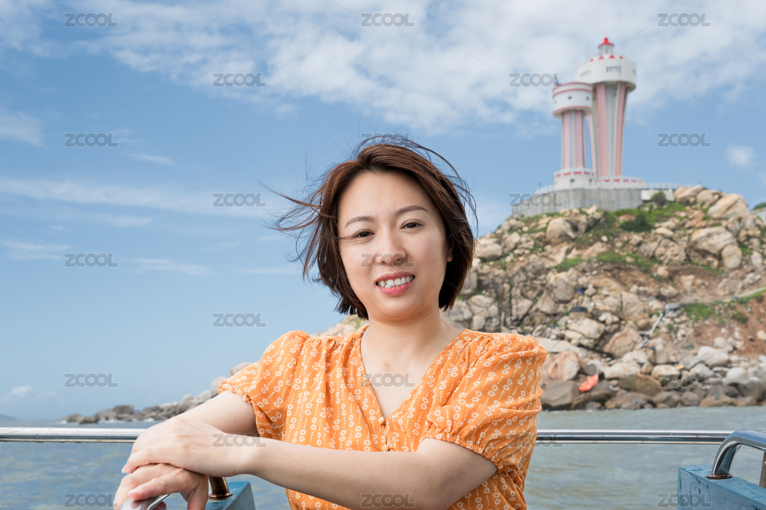 女子于船上與燈塔合影