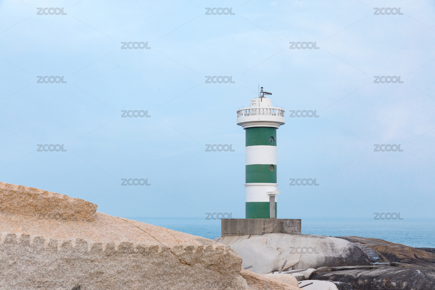 海邊沙灘前礁石旁的燈塔