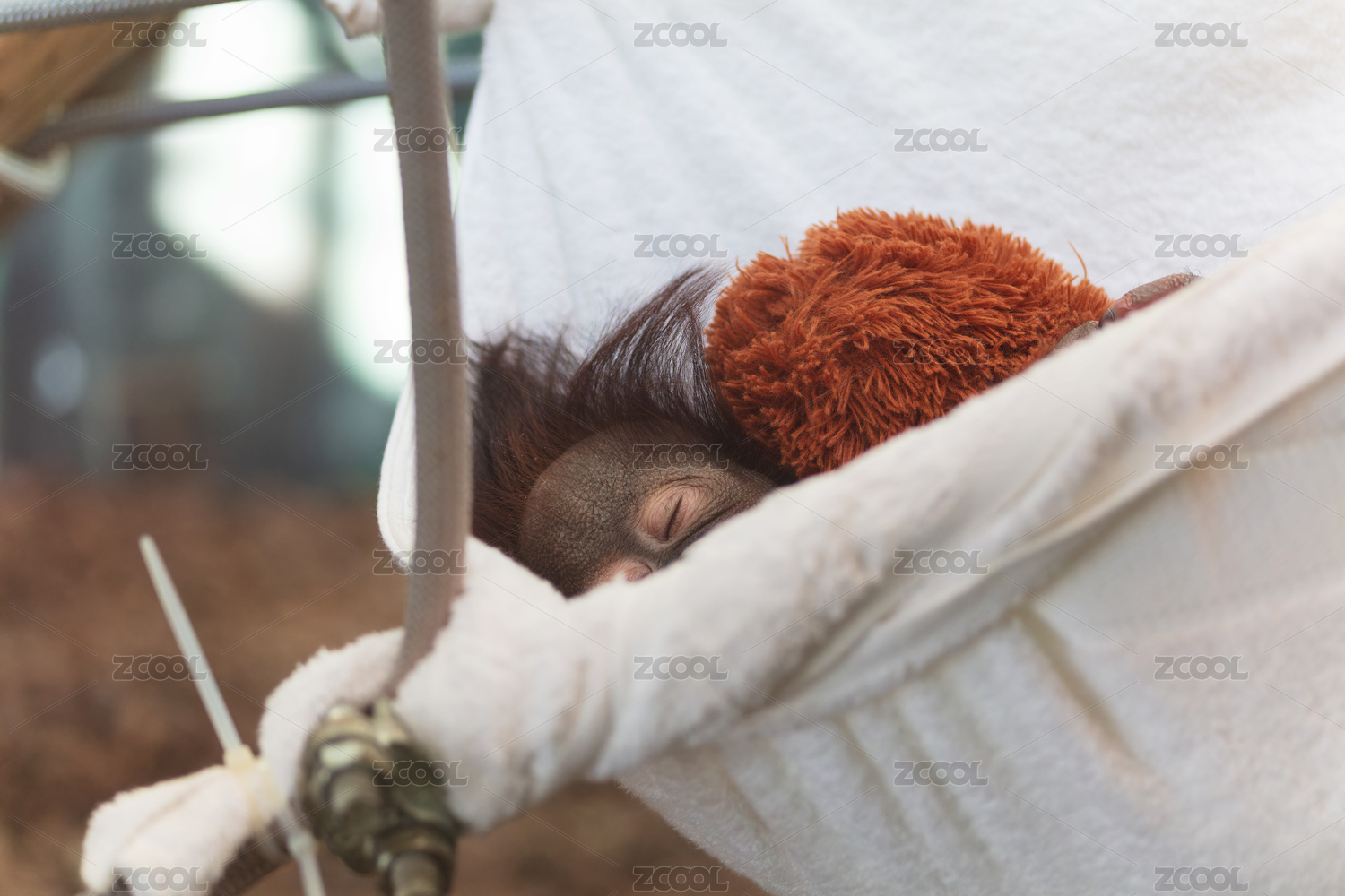 紅毛猩猩在吊床中抱玩偶安睡
