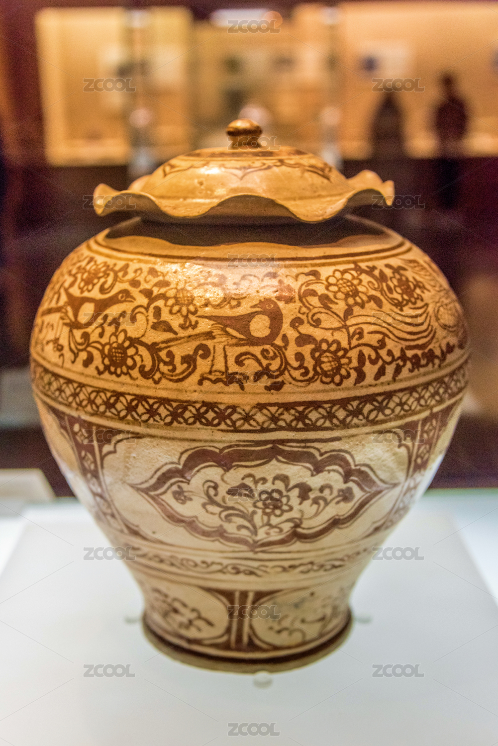 中國廣東省博物館釉下褐彩鳳鳥紋荷葉蓋罐