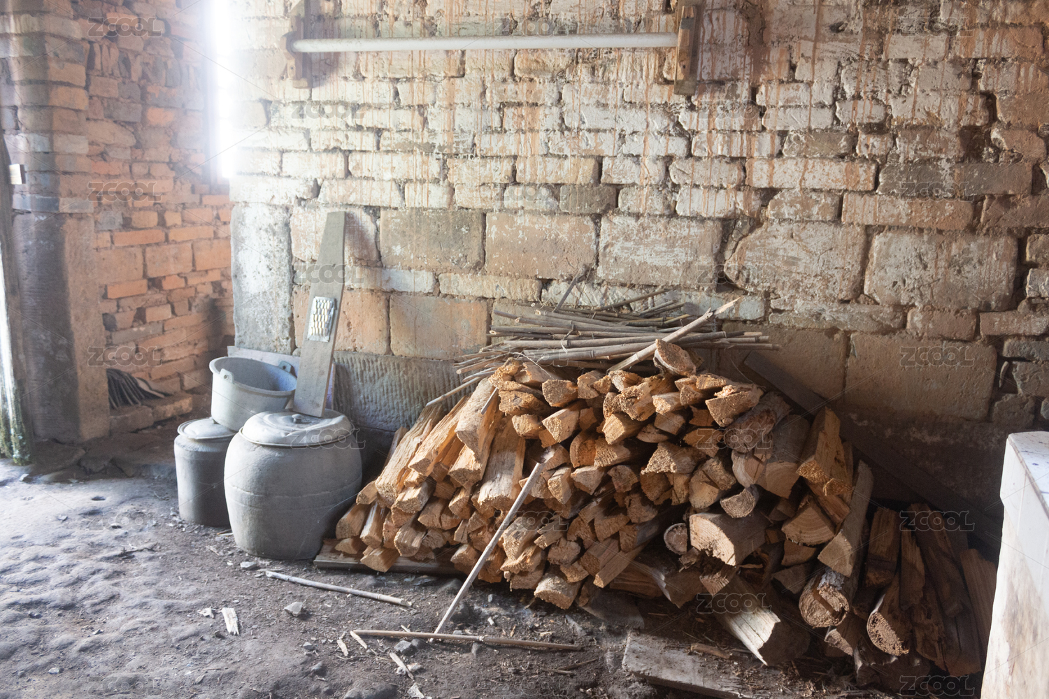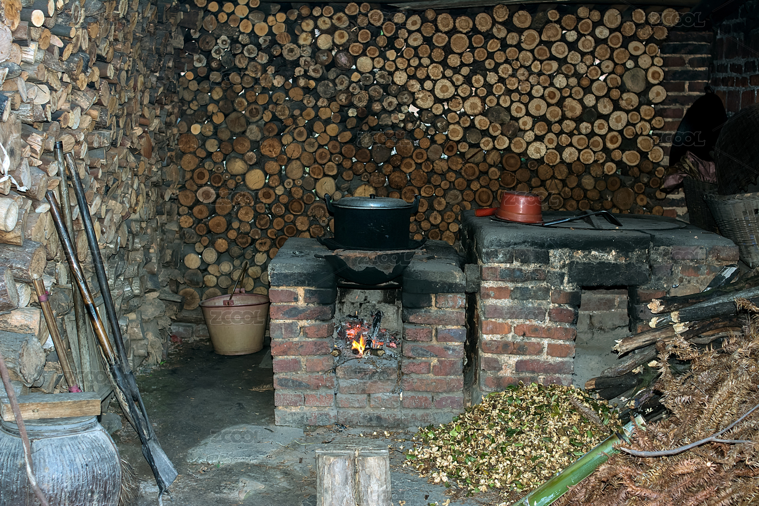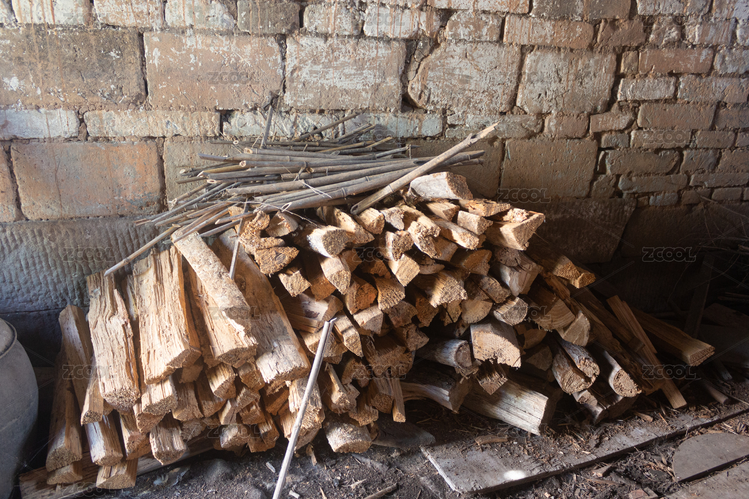 農(nóng)村破舊房子的廚房一角堆放的柴火