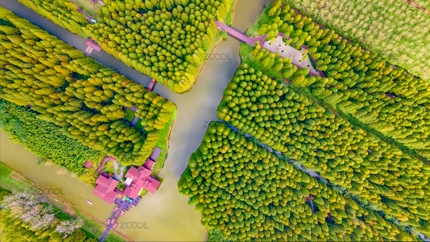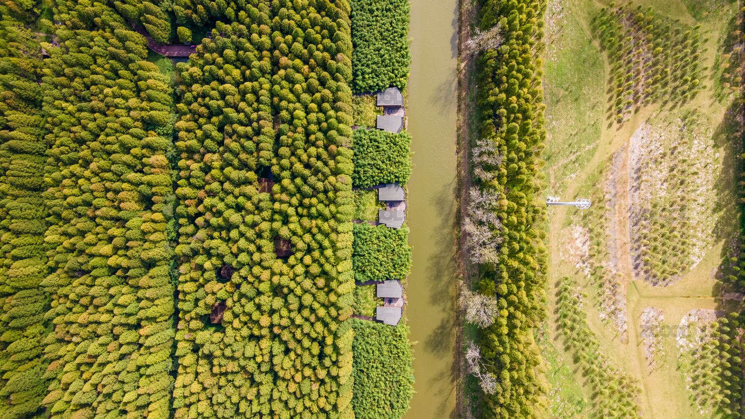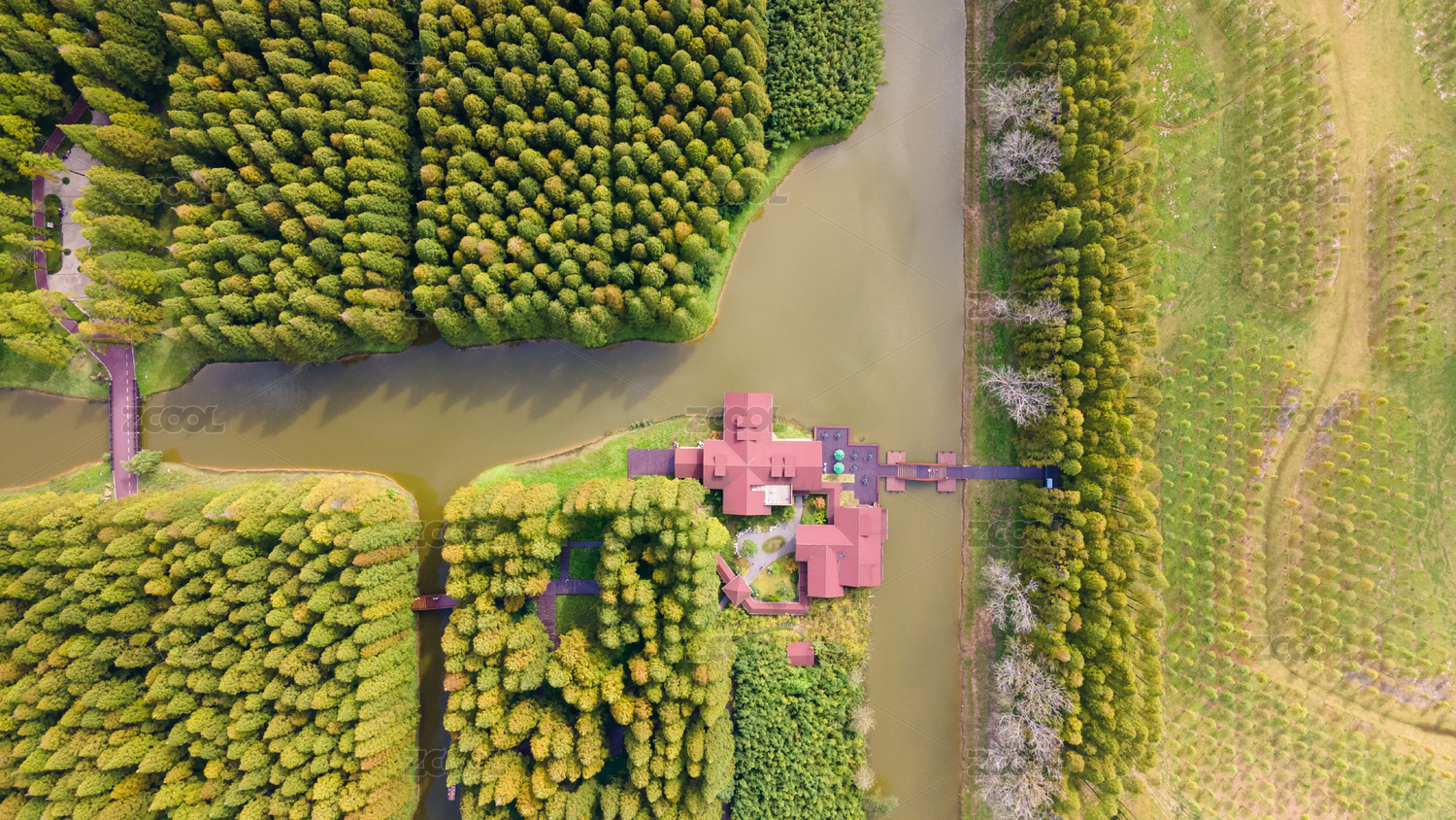 航拍秋天的鹽城東臺黃海森林公園與萬畝良田