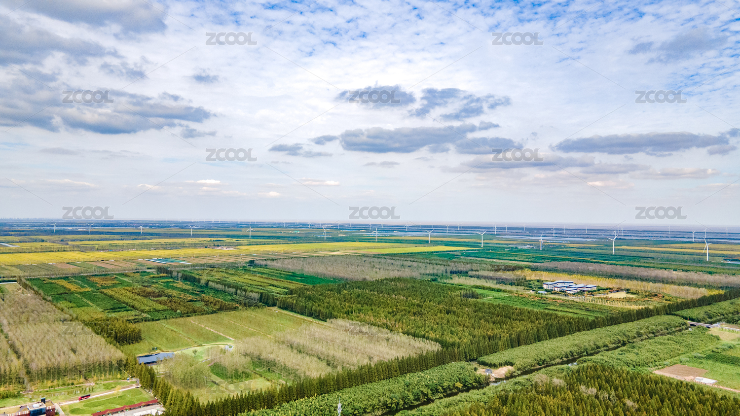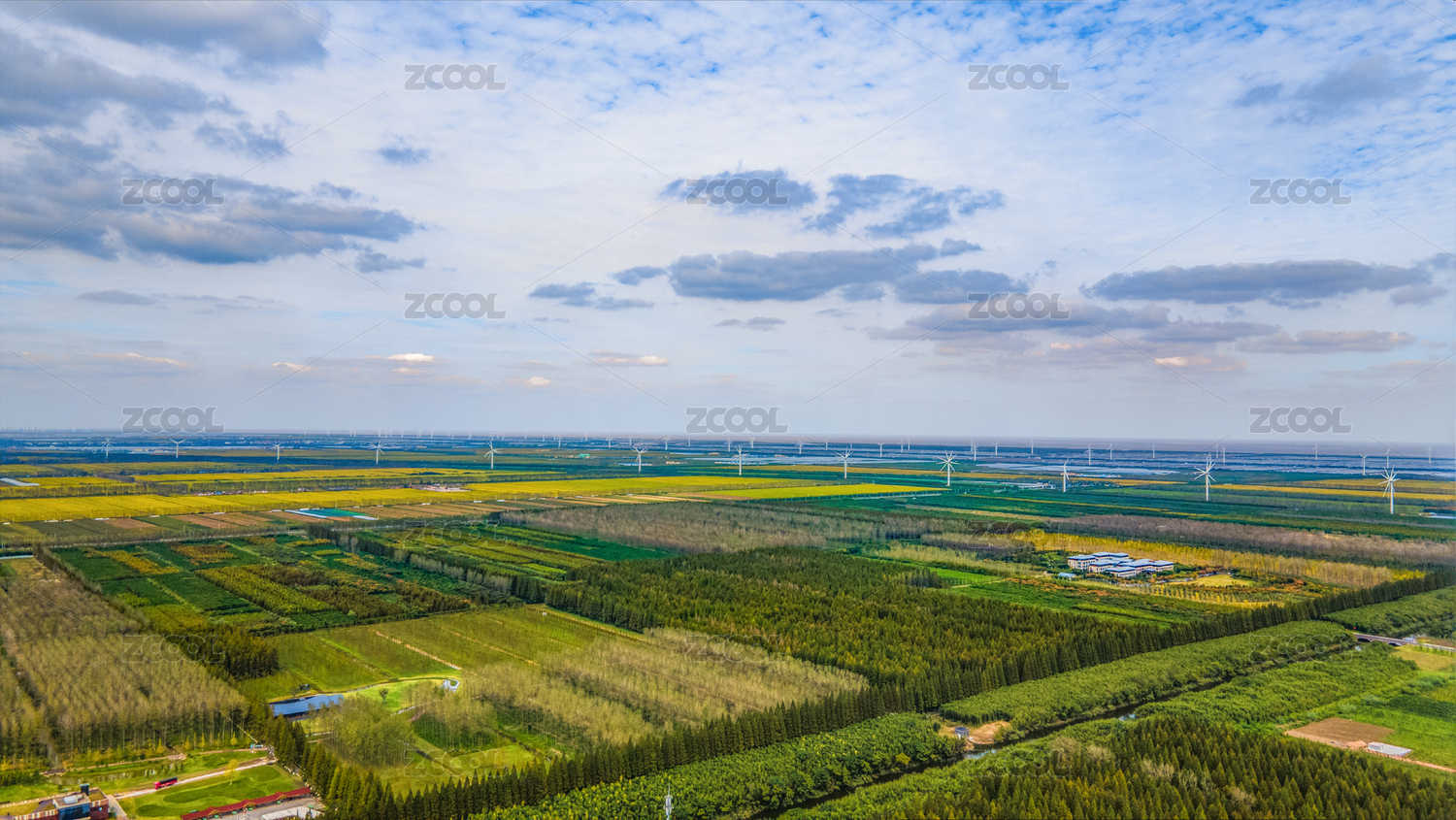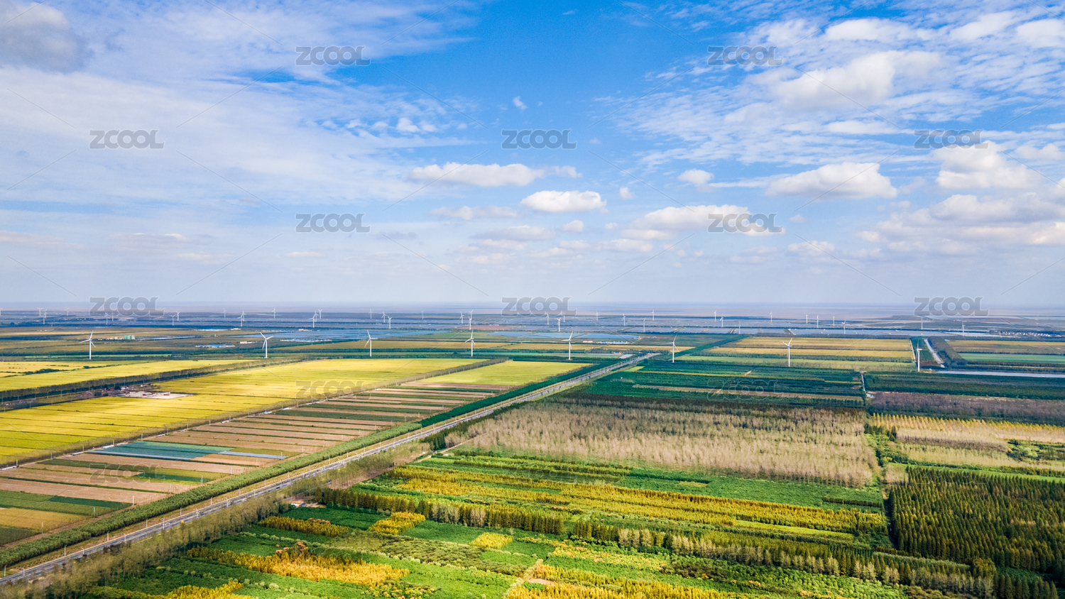 航拍鹽城東臺豐收的萬畝良田、黃海森林公園