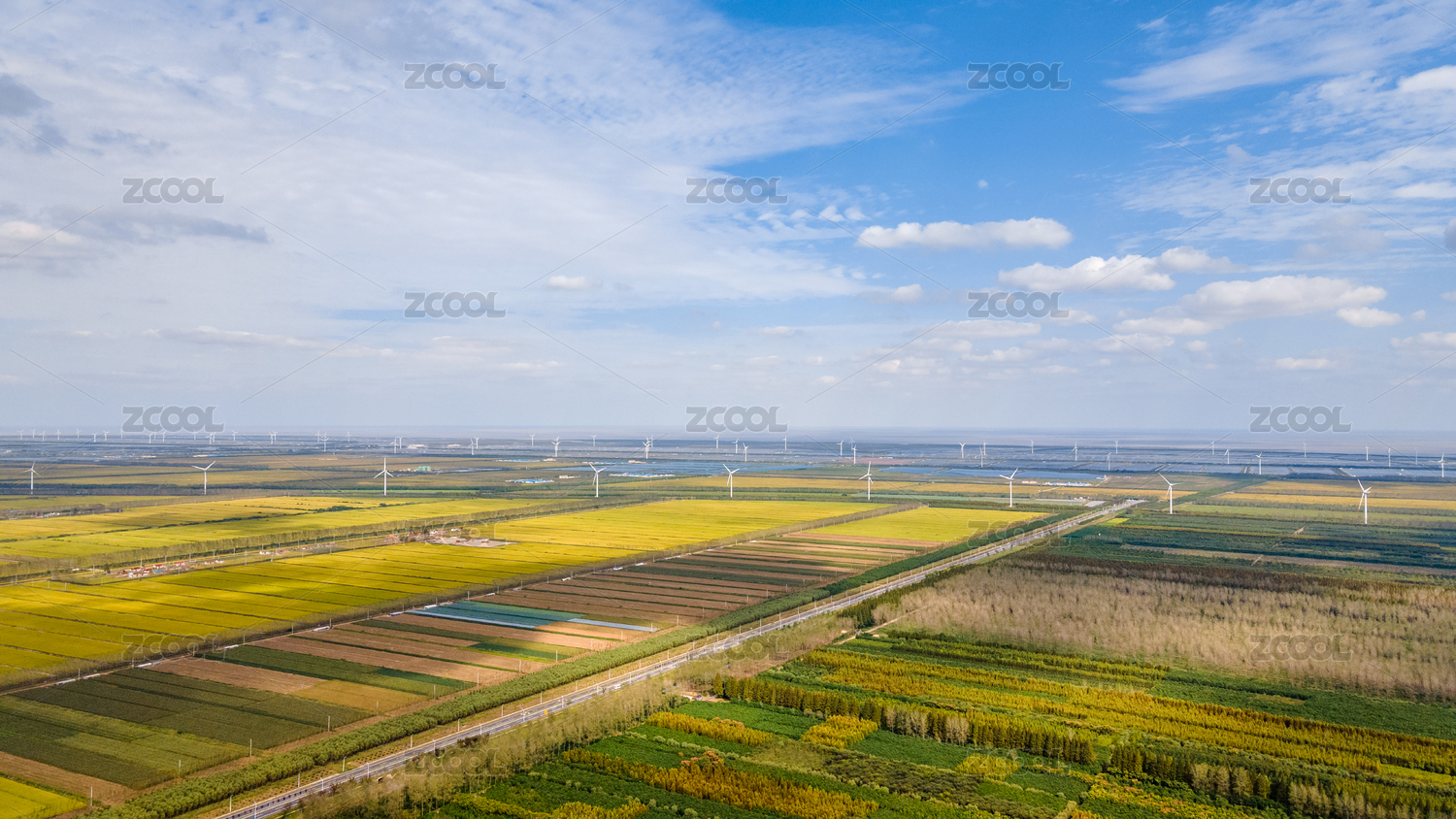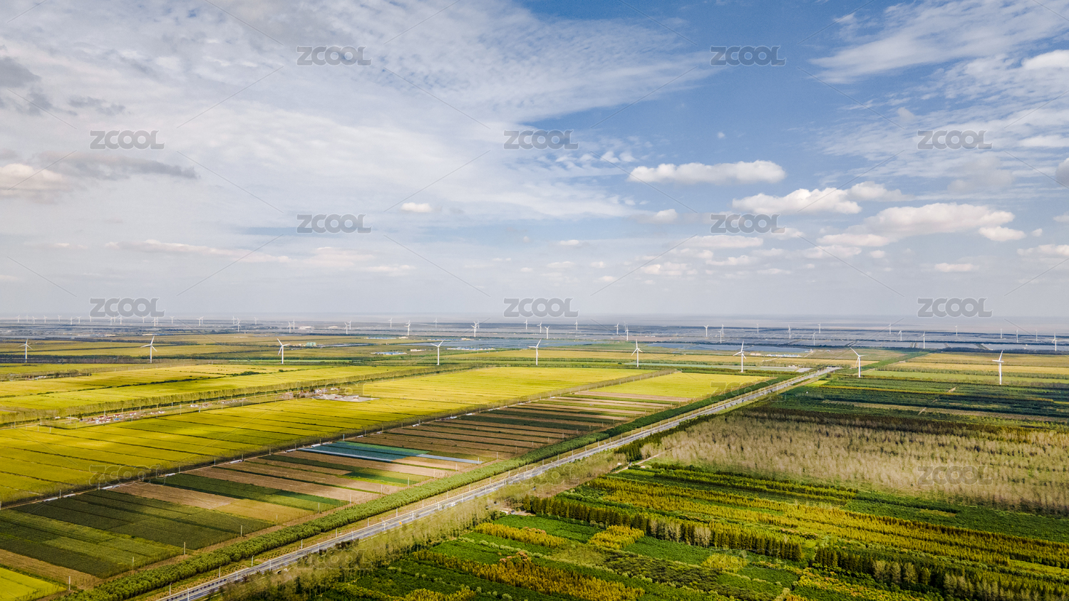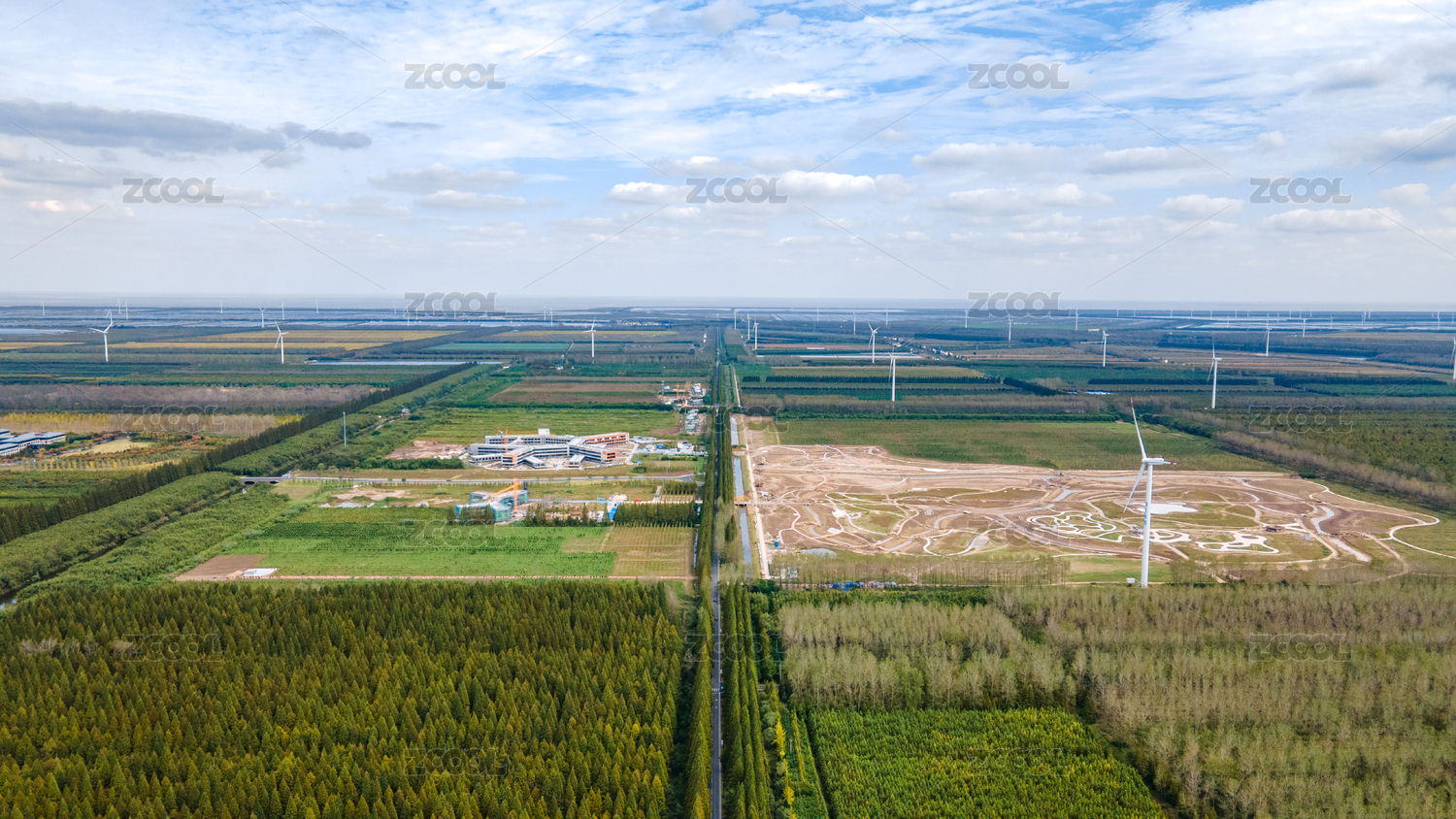 航拍鹽城東臺豐收的萬畝良田、黃海森林公園