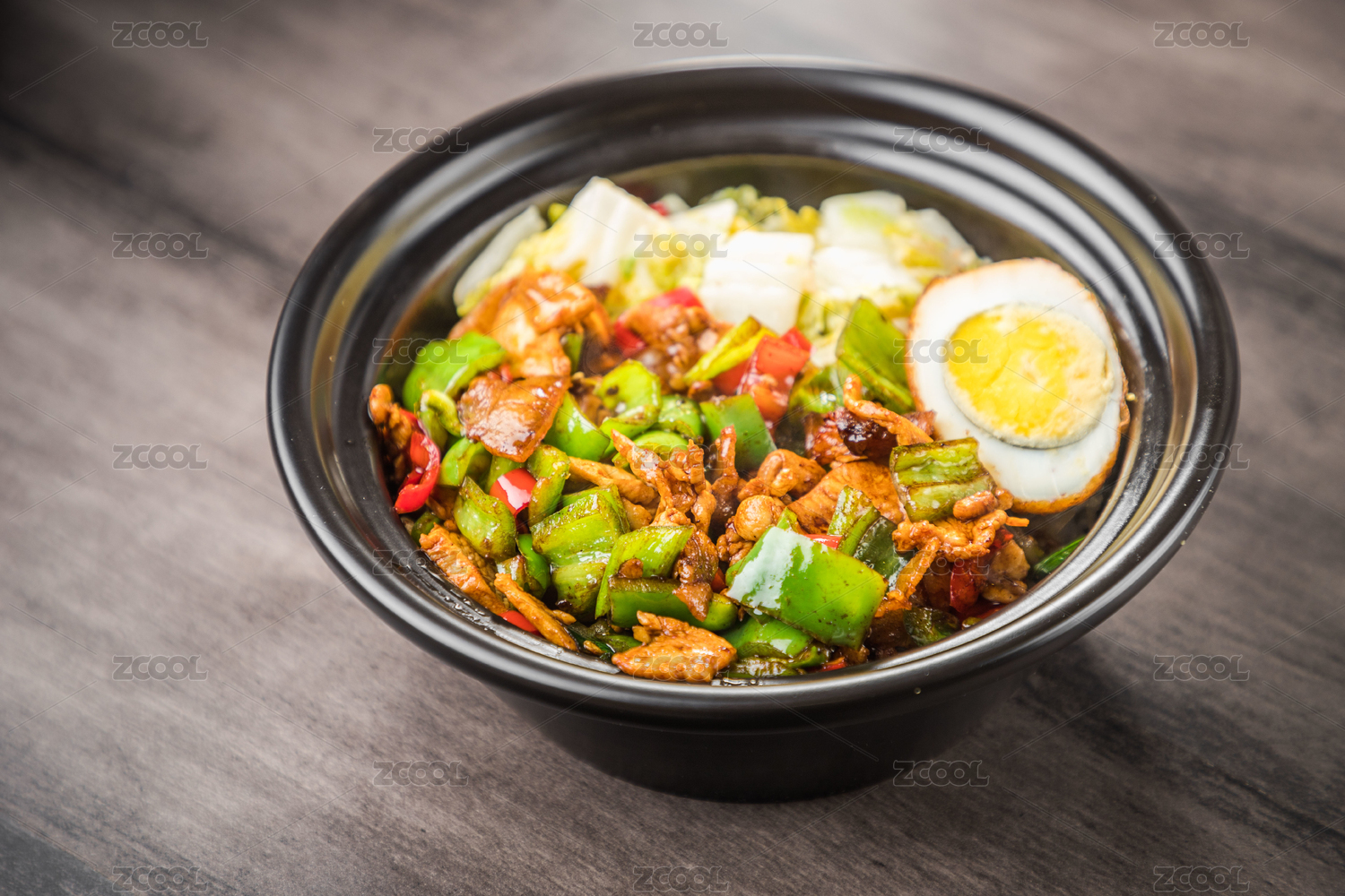 暗色木紋卓上放著一碗青椒小炒肉煲仔飯