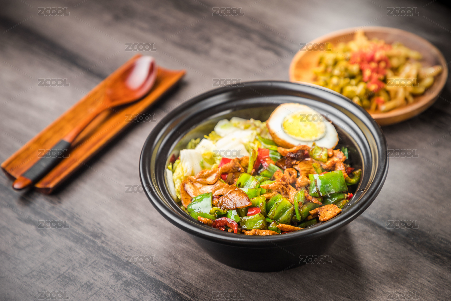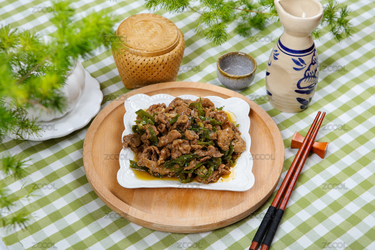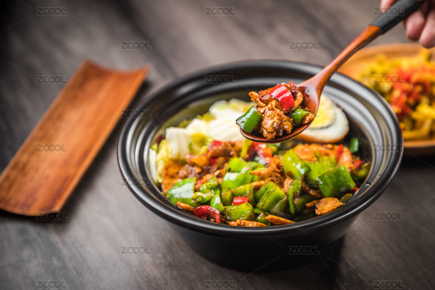 木底上放著一盤青椒小炒肉