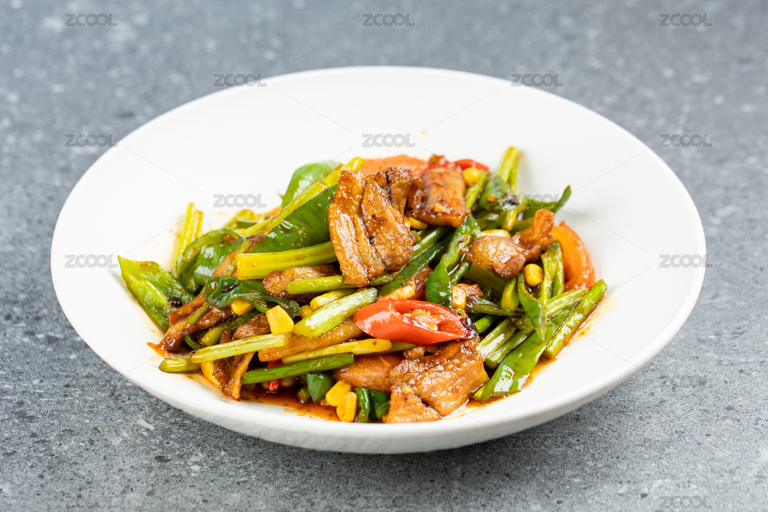 排在盤子里的青椒小炒肉俯拍