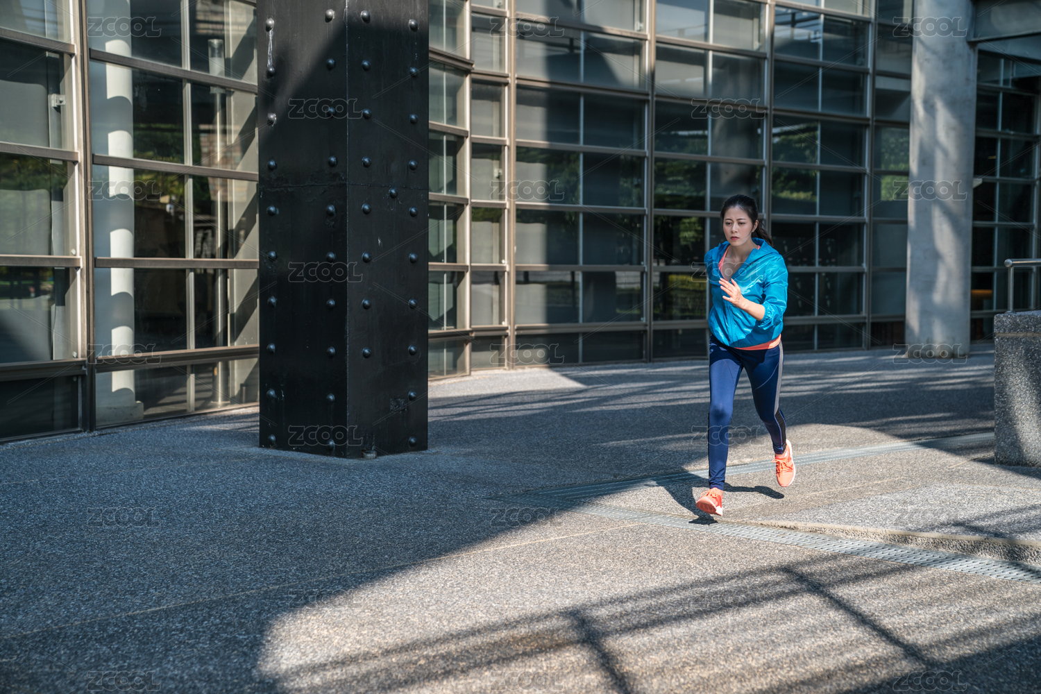 在現(xiàn)代城市美麗的年輕女子在運(yùn)動(dòng)服裝的運(yùn)行沿街圖像。
