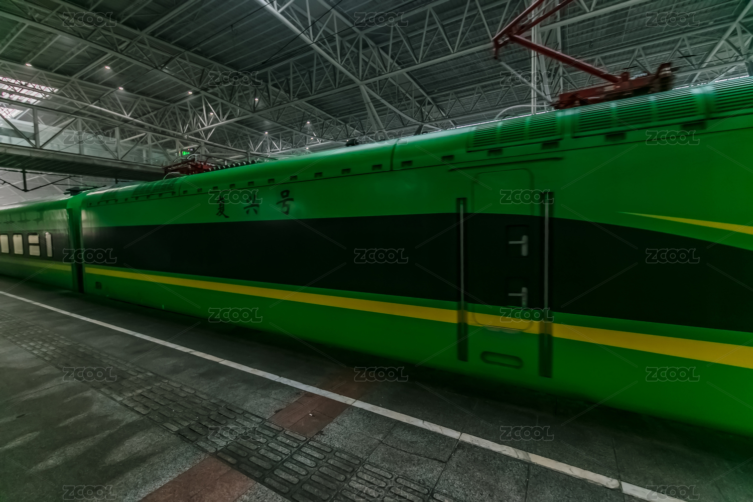 高鐵車站里停泊檢修檢查的綠色復(fù)興號(hào)列車動(dòng)