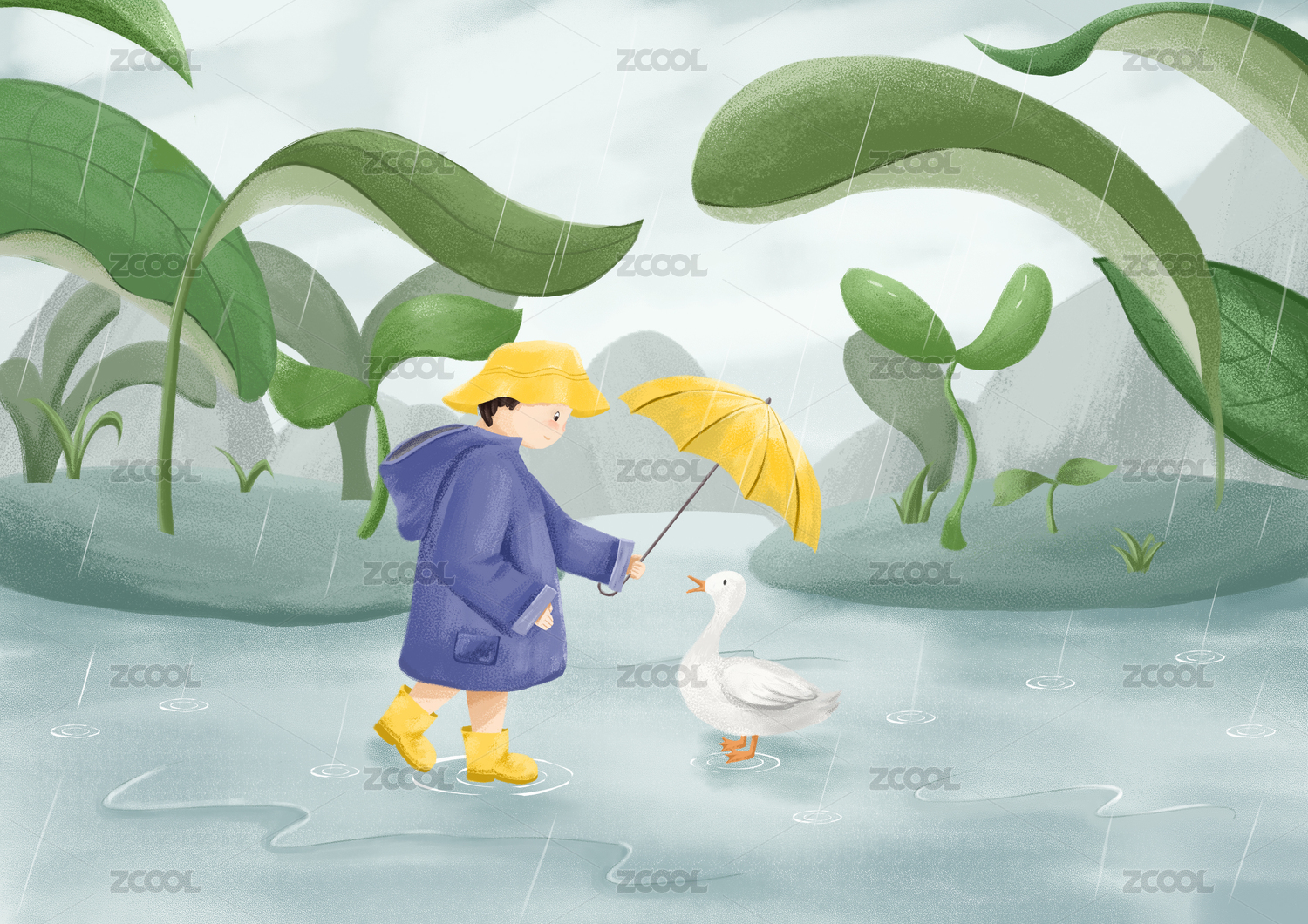 春季雨水節(jié)氣下雨天給小鴨子打傘手繪插畫