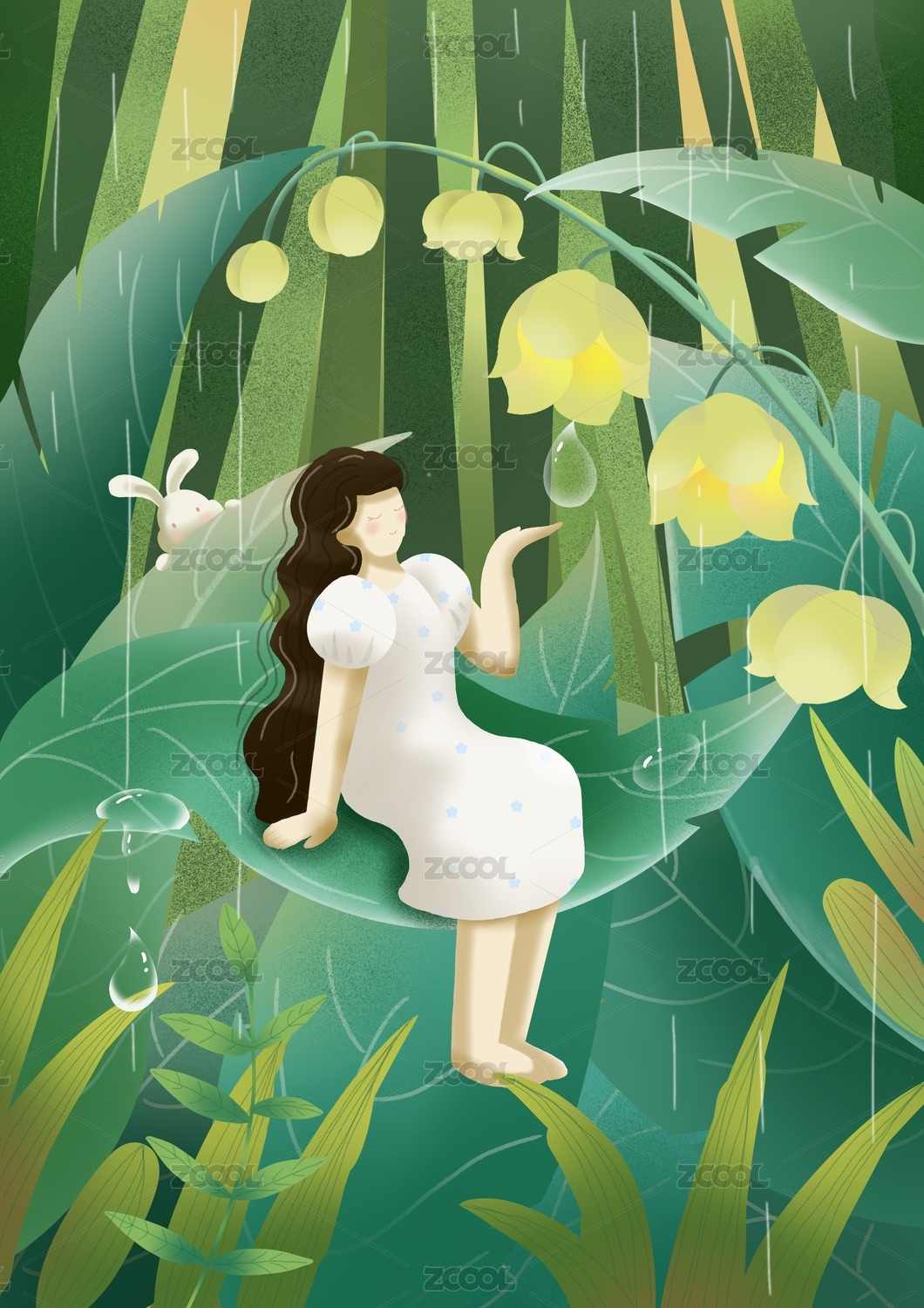 雨水節(jié)氣下雨時(shí)女孩和兔子在森林靜坐玩耍