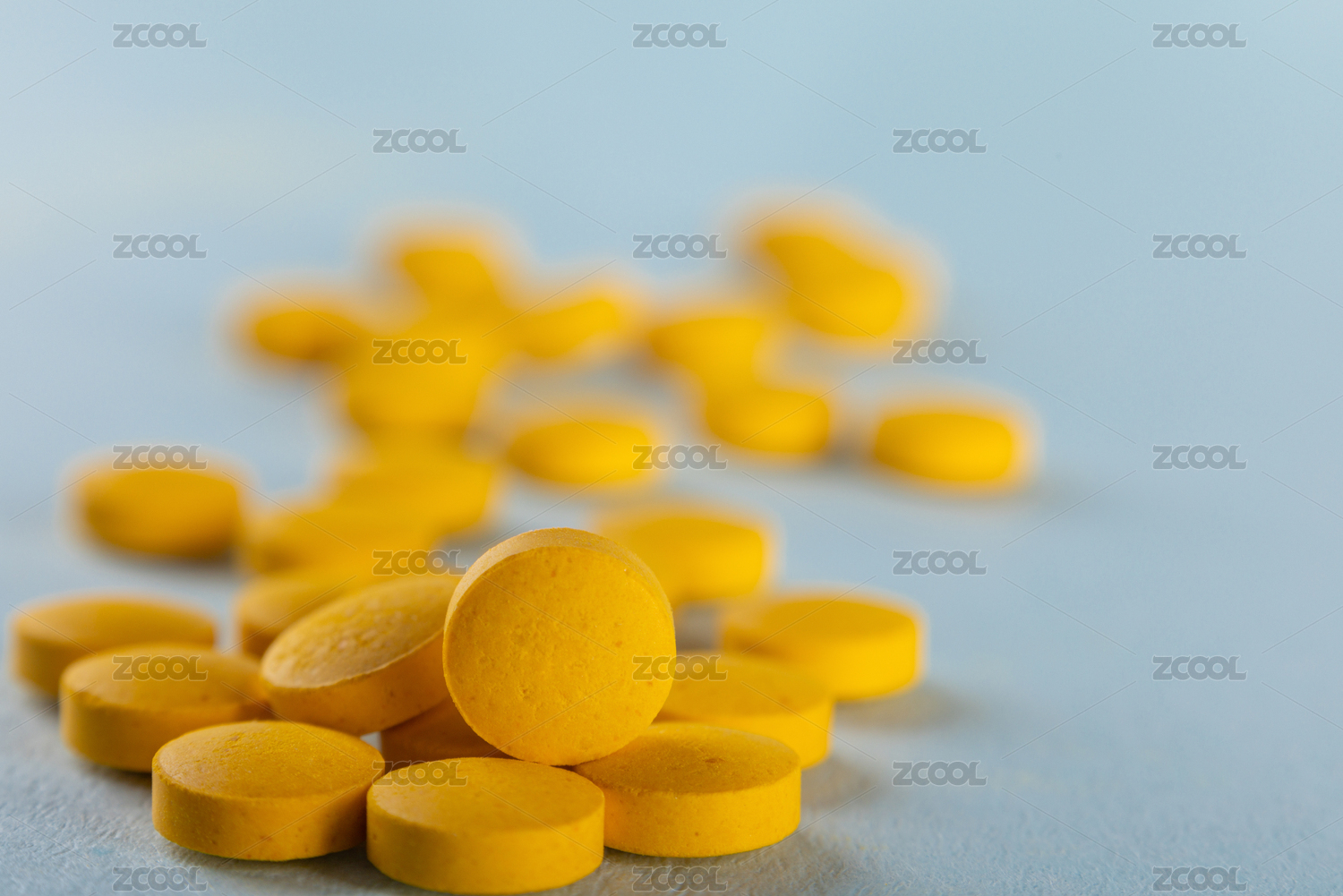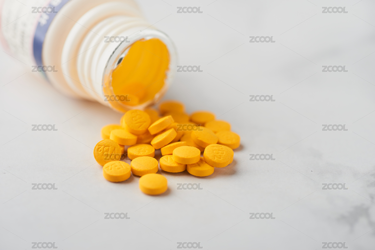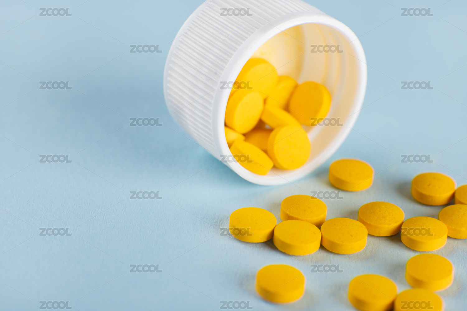 黃色藥片從瓶子里倒出來藍(lán)色背景