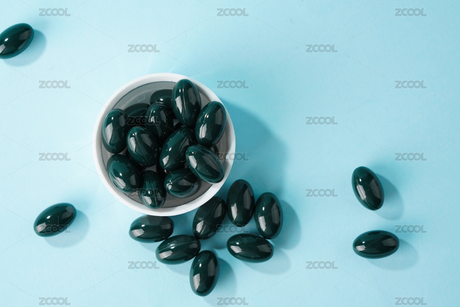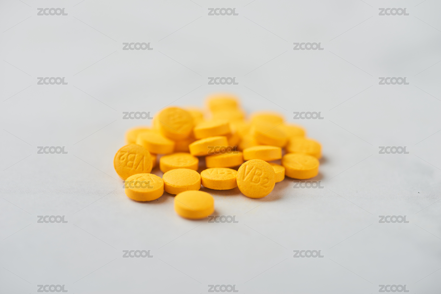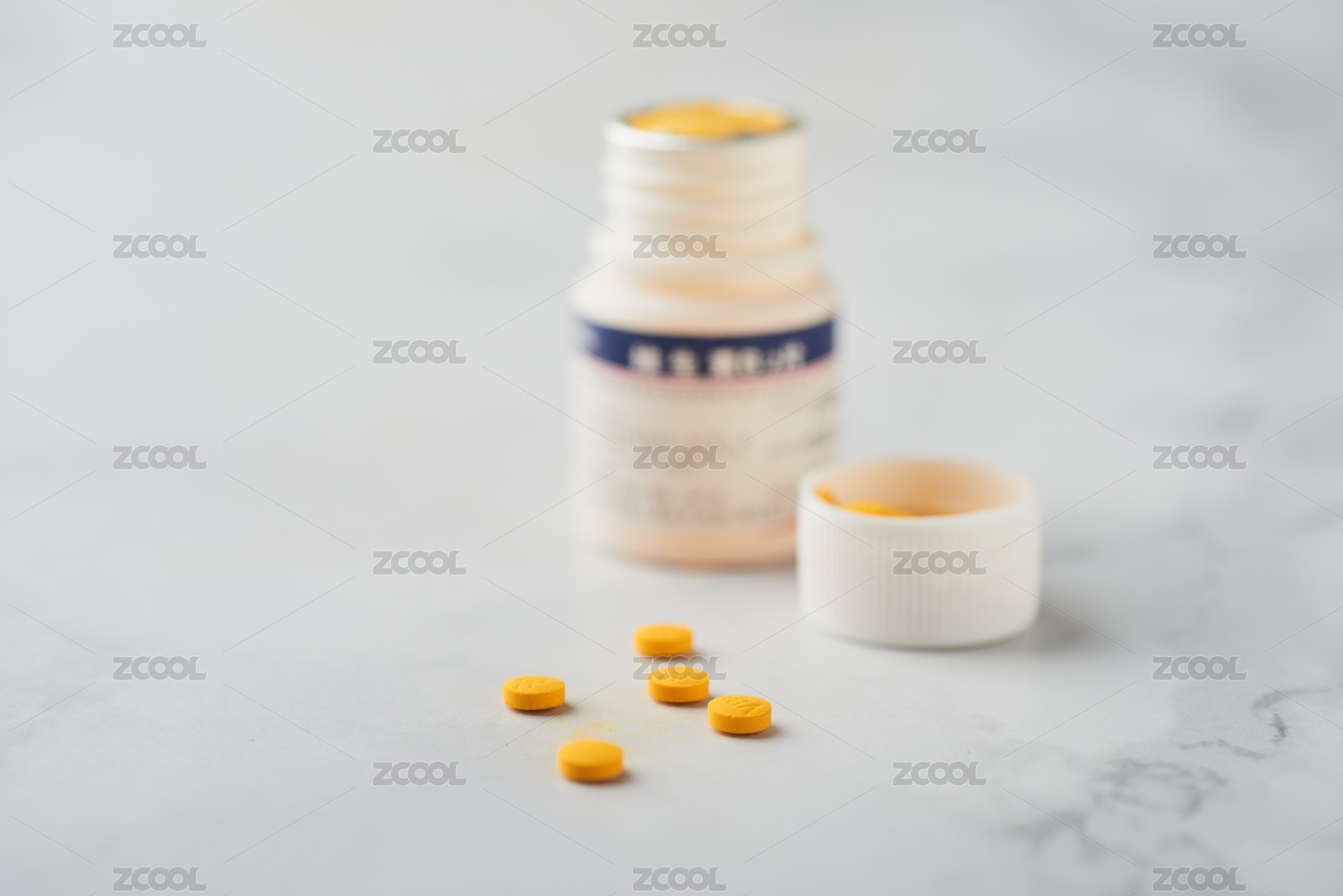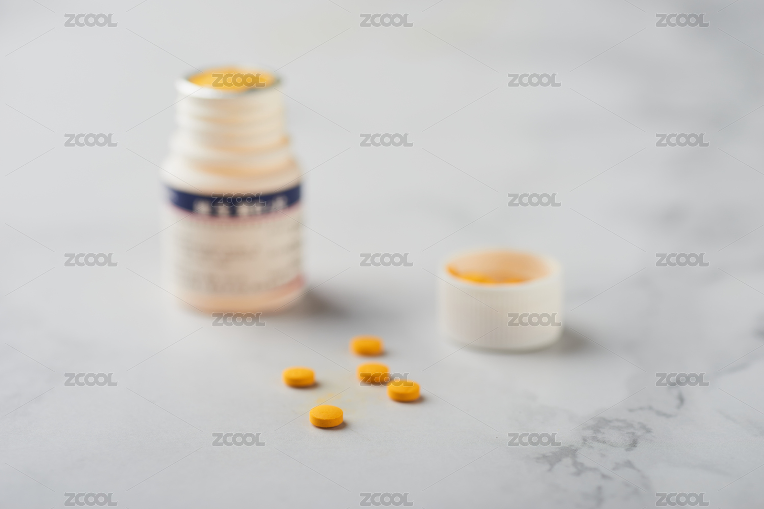 黃色藥片從瓶子里倒出來藍(lán)色背景