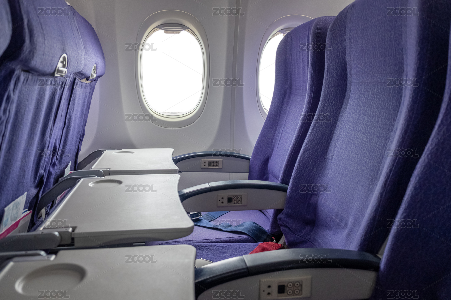 客運(yùn)飛機(jī)客艙內(nèi)靠窗沒有人并放下了桌板座位