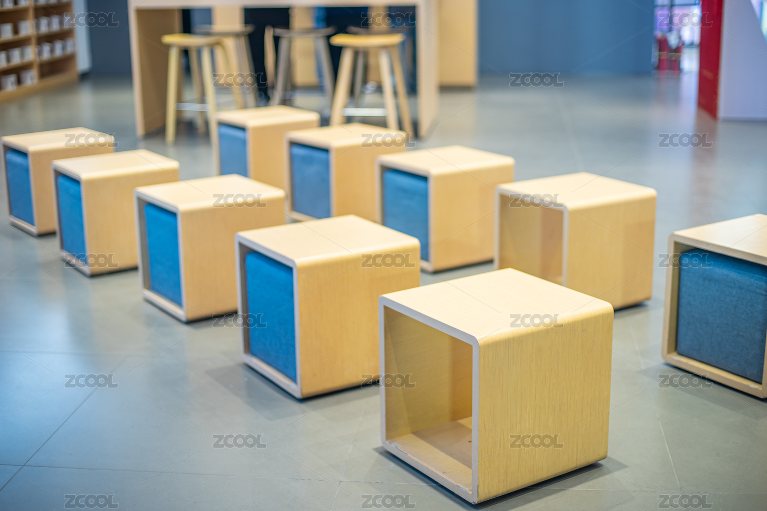 木制黃色的木制桌子座位排列成一排