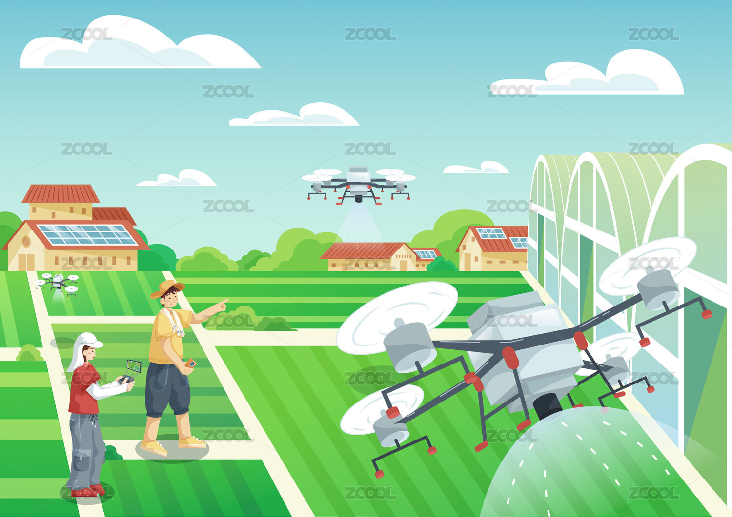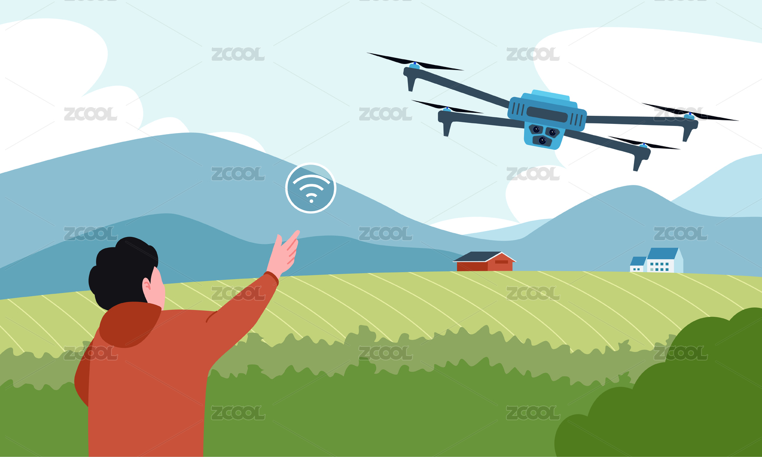 手拿遙控器控制無(wú)人機(jī),背景是農(nóng)村矢量插畫