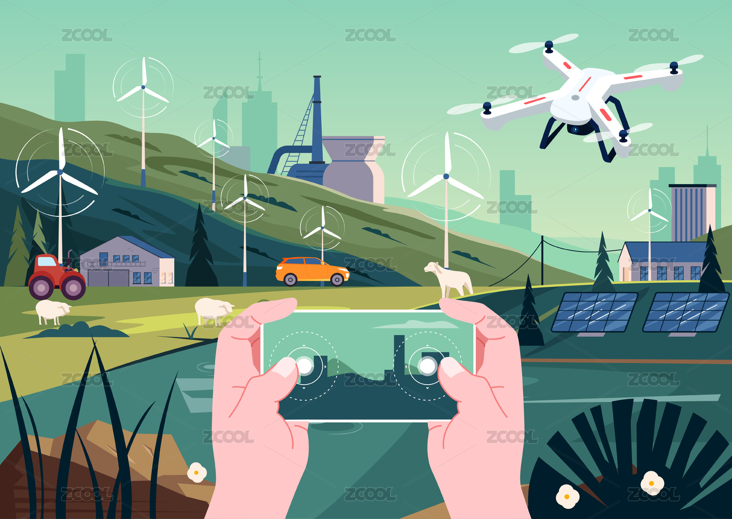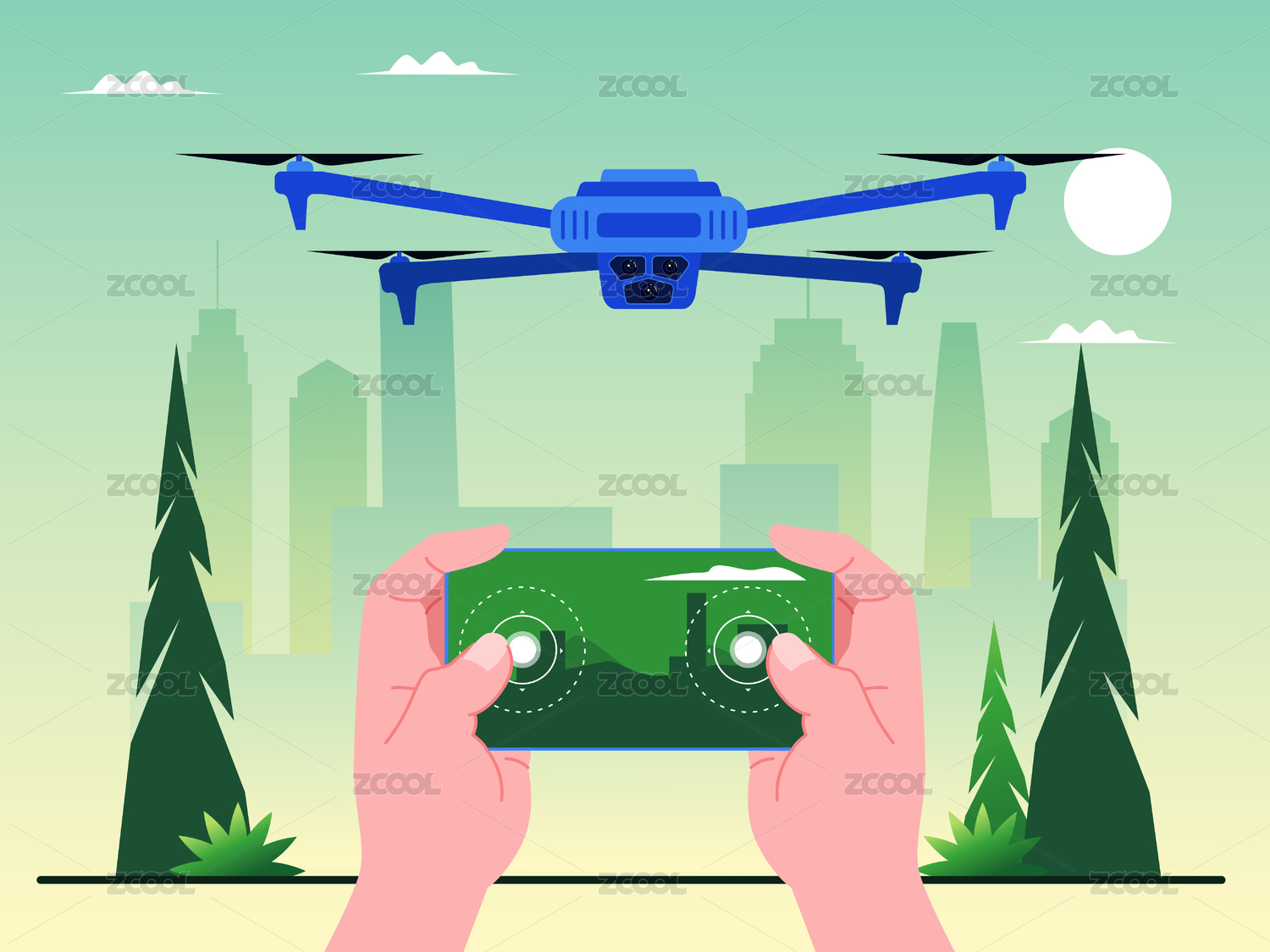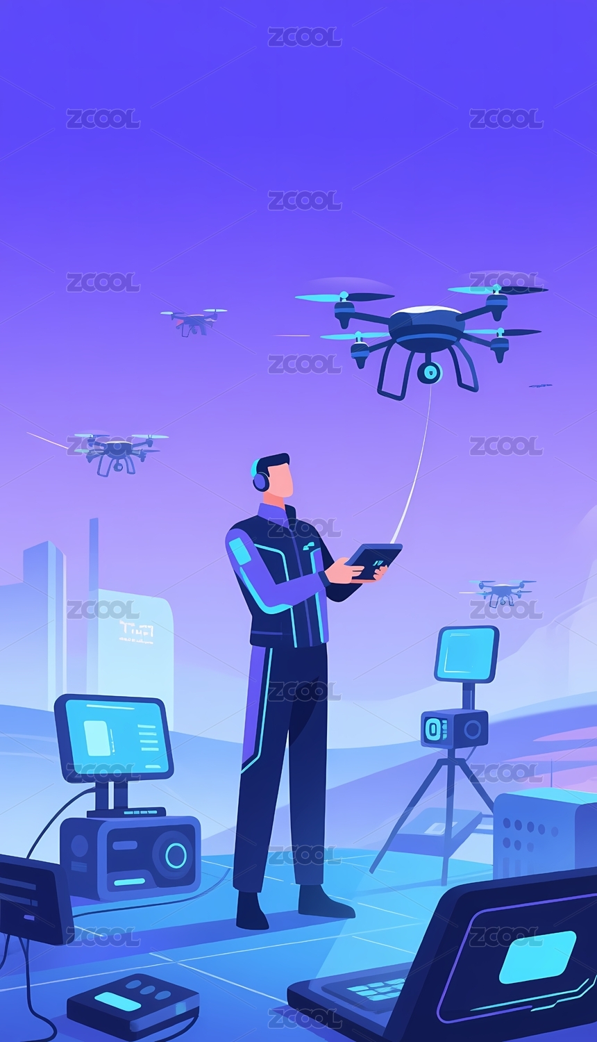 科技感插畫手拿移動(dòng)終端操作無(wú)人駕駛無(wú)人機(jī)