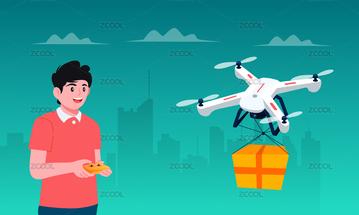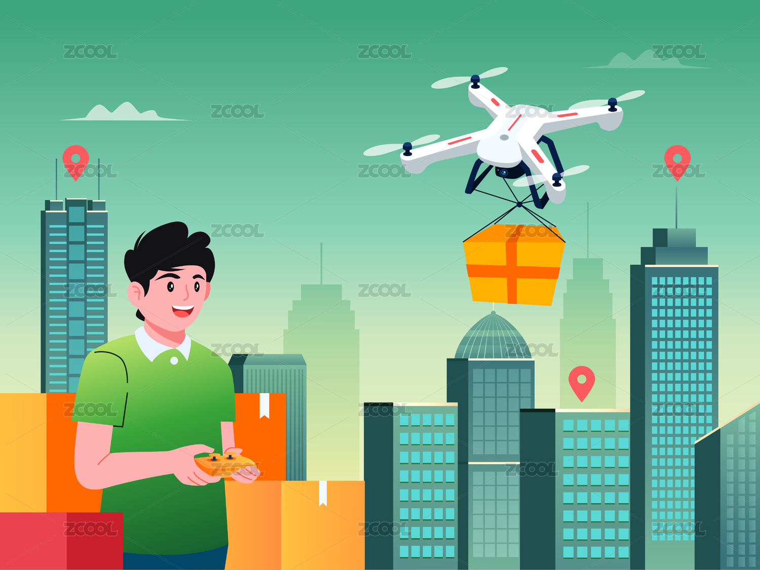 一個(gè)男子正在控制無(wú)人機(jī)運(yùn)輸貨物矢量插畫