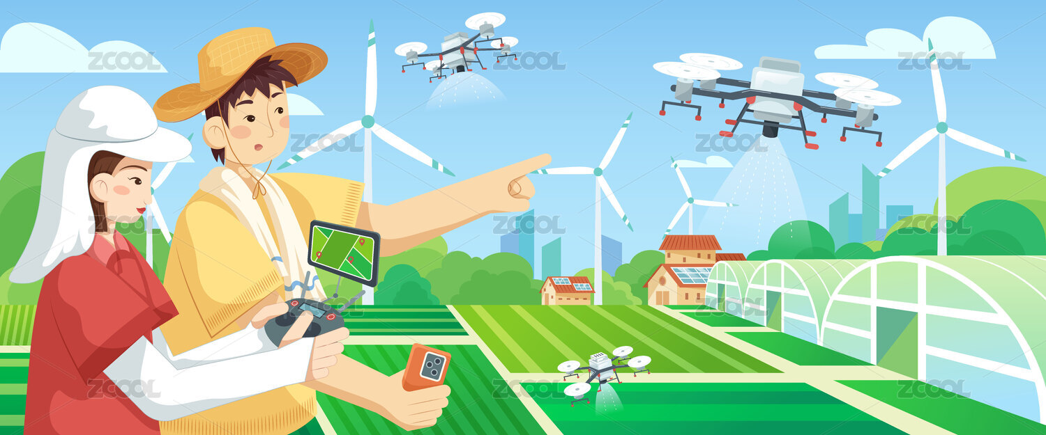 一個(gè)男子正在控制無(wú)人機(jī)背景是農(nóng)田矢量插畫