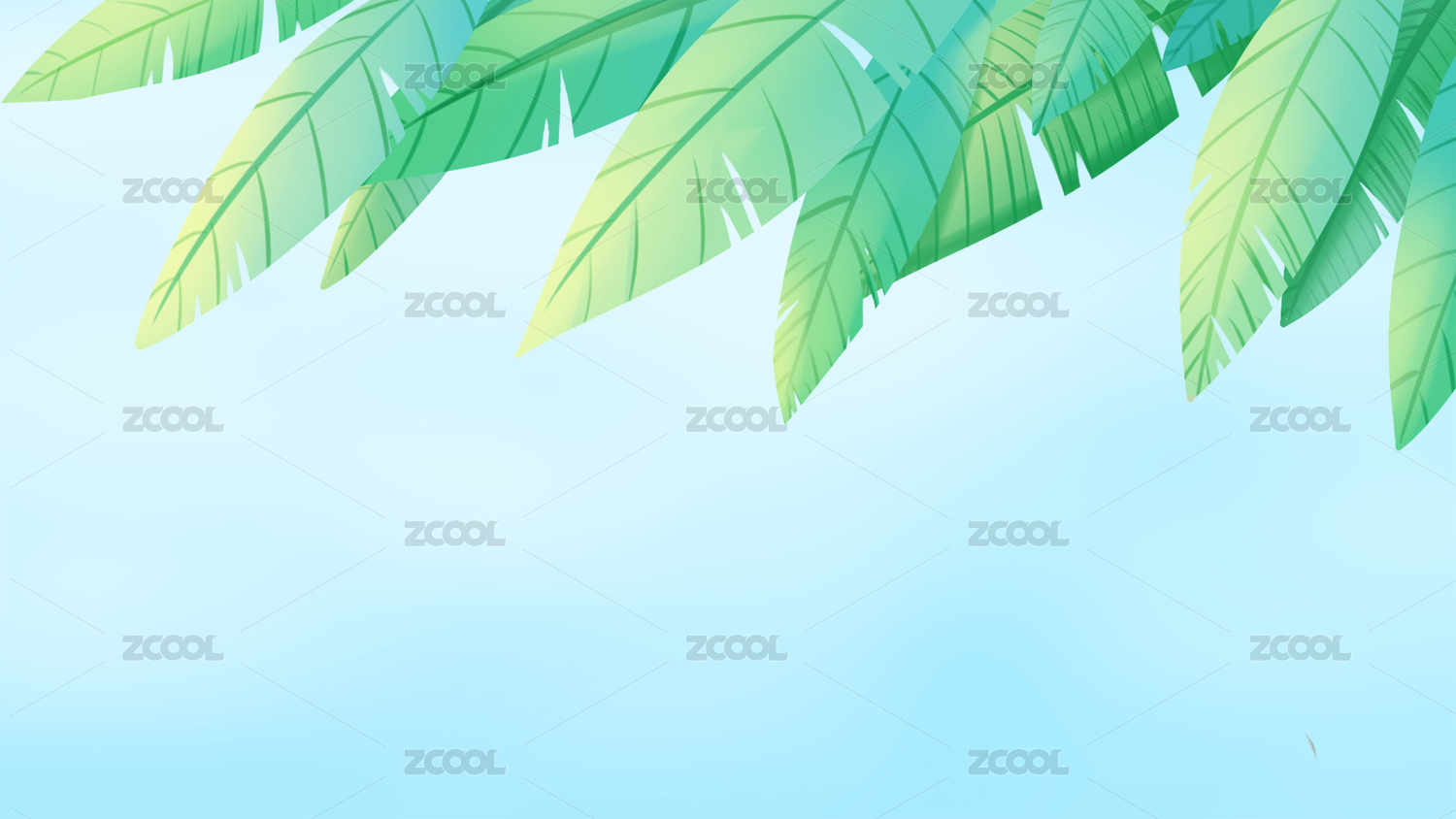藍(lán)空上方是綠色的熱帶樹葉,陽光照在綠葉上,綠色調(diào)為主的唯美卡通風(fēng)格插畫