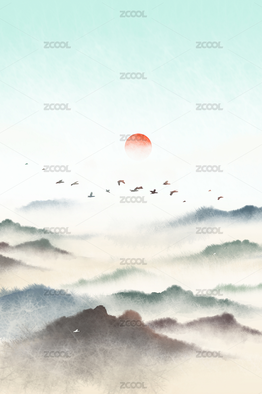 中國風(fēng)山水意境小清新風(fēng)格藍(lán)綠色調(diào)風(fēng)景插畫