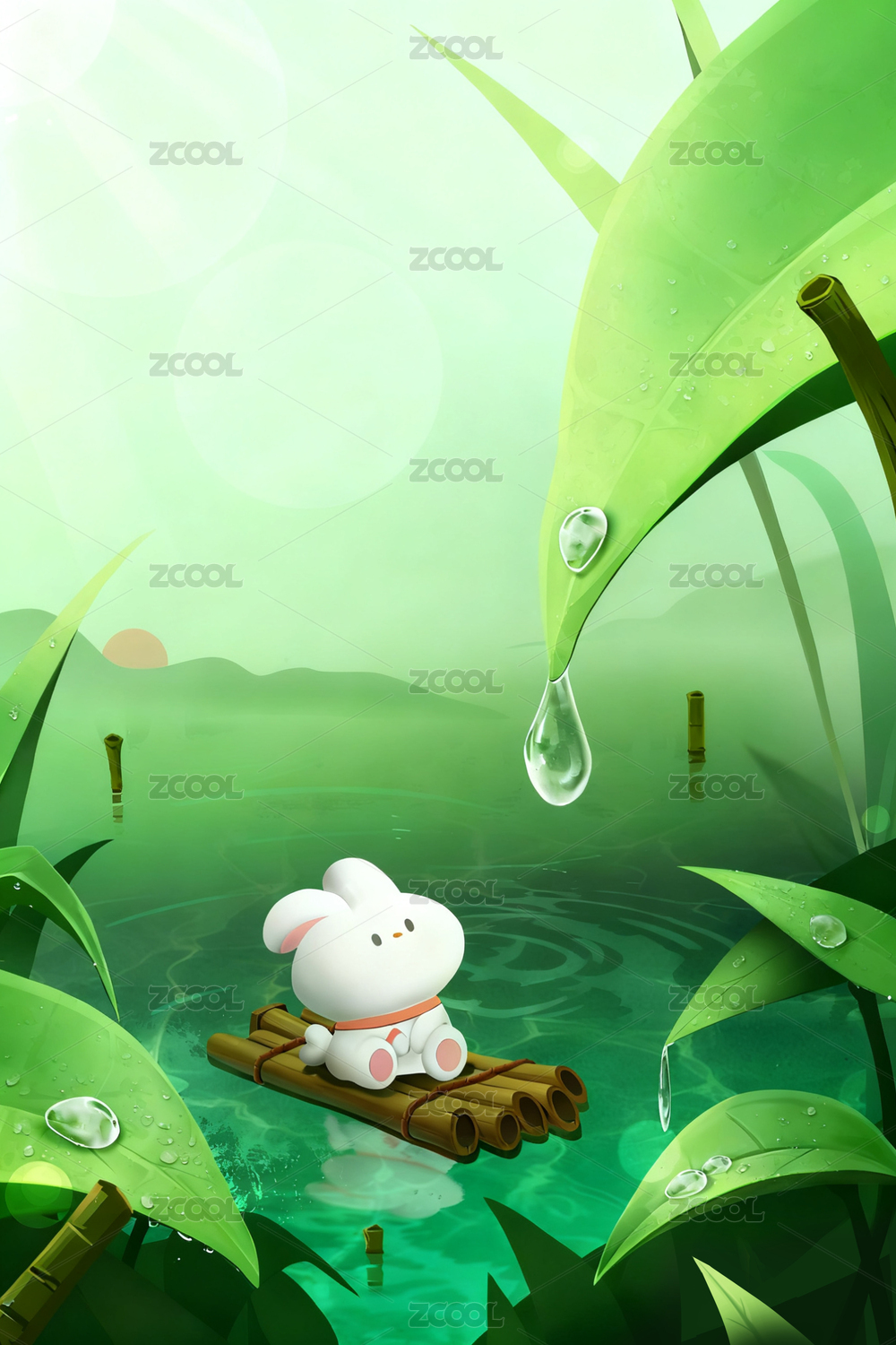 清晨露水時兔子乘著竹筏在河邊游蕩