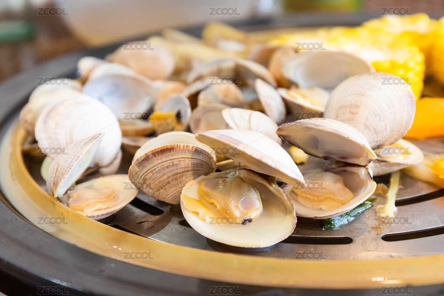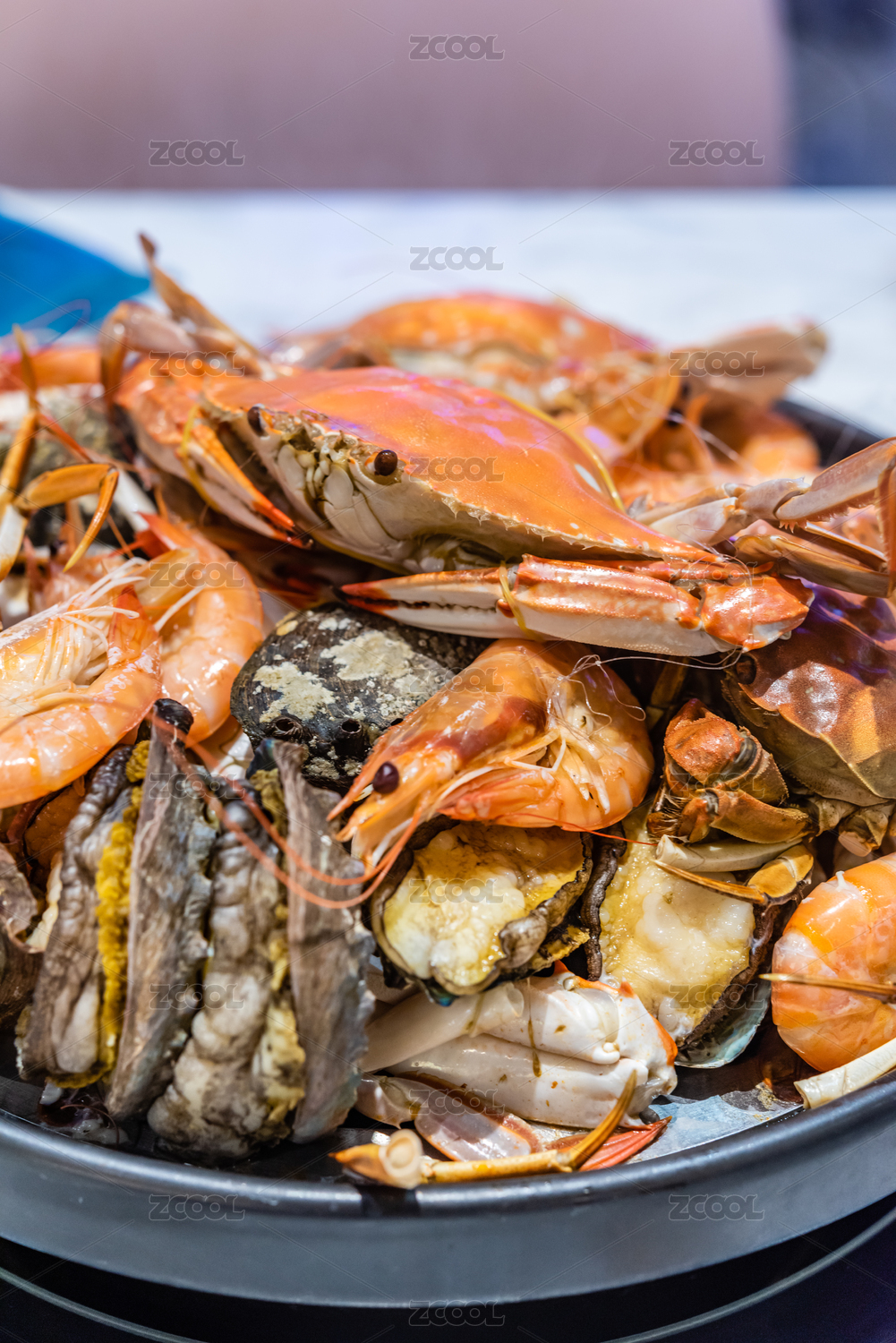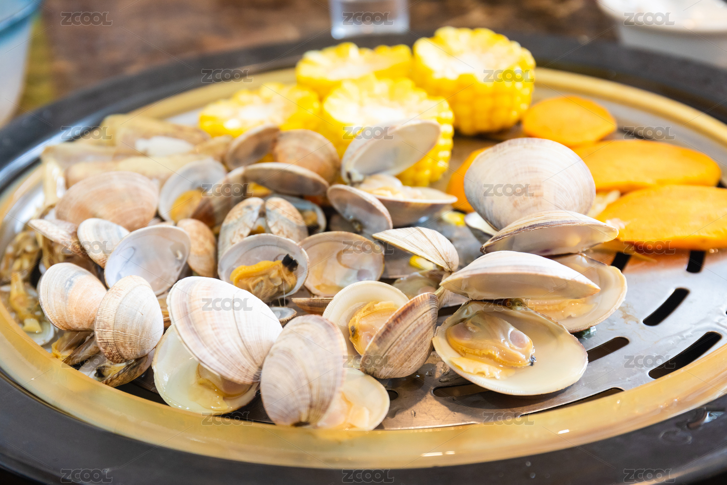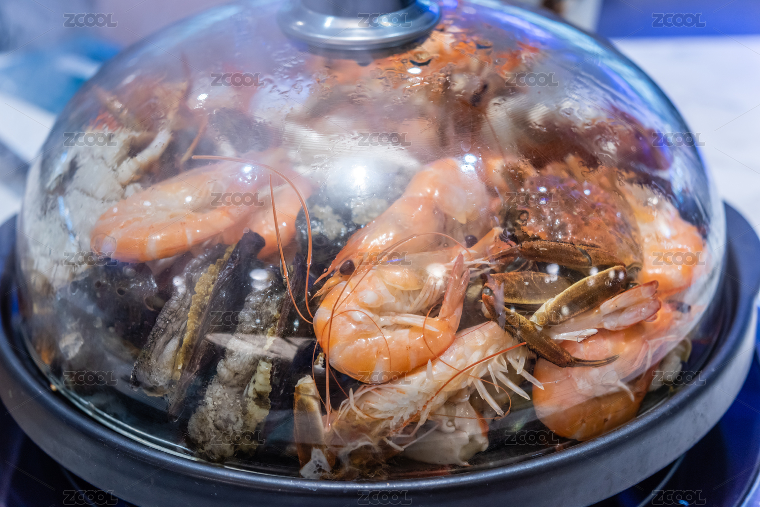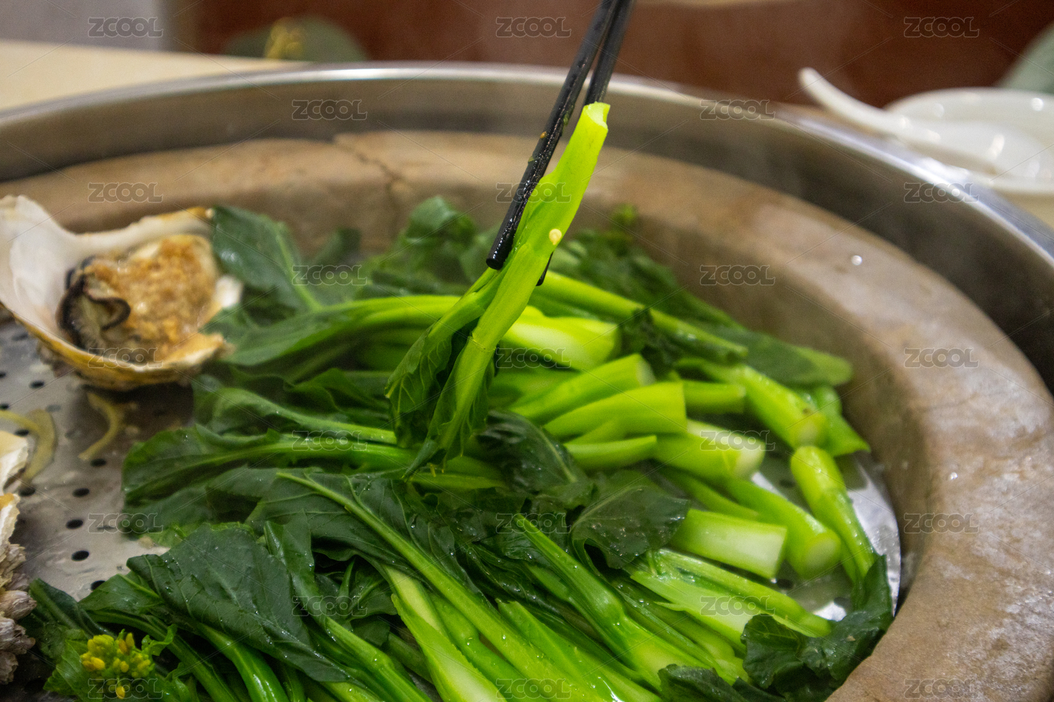 餐桌上蒸汽海鮮火鍋剛剛燙熟的新鮮菜心青菜