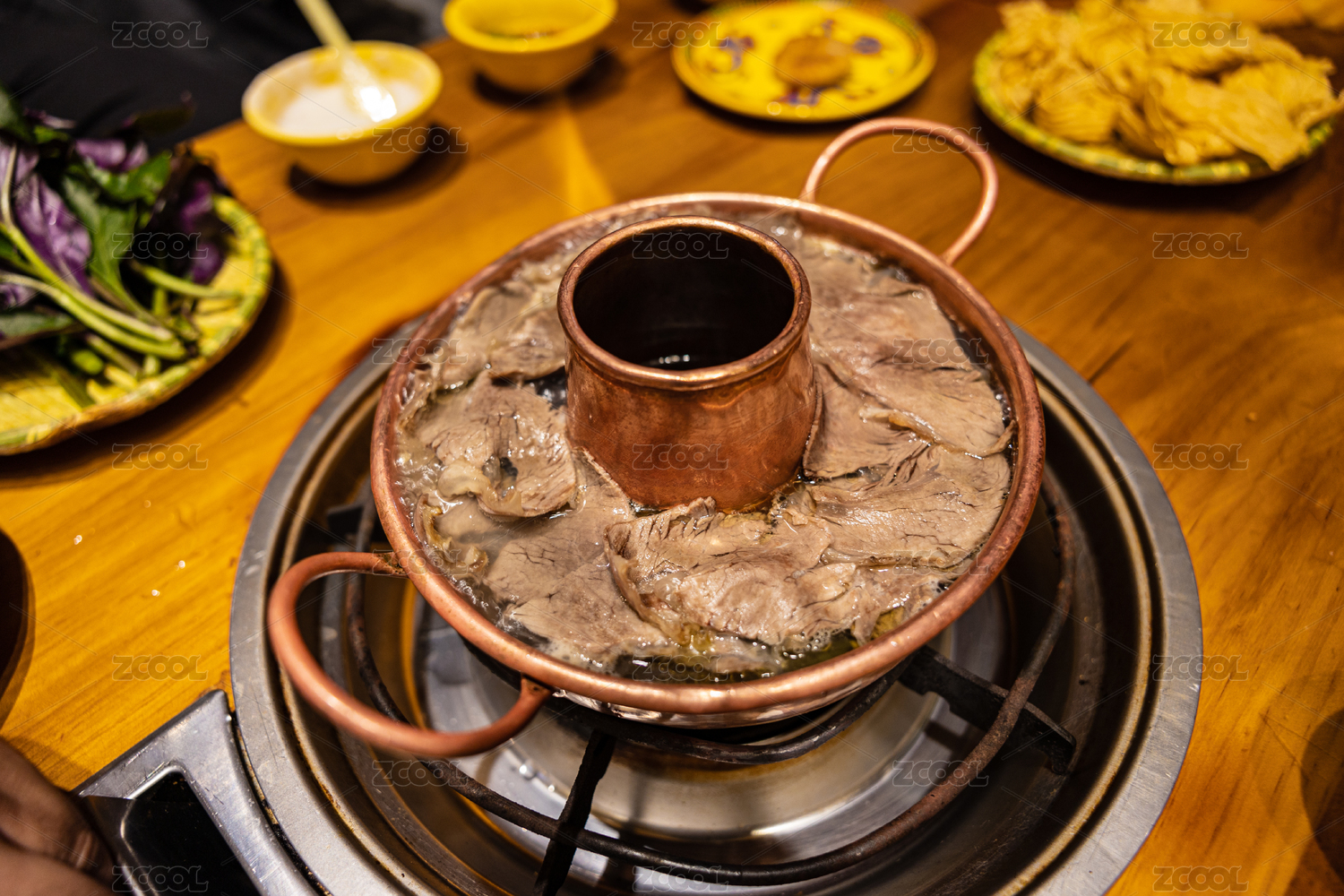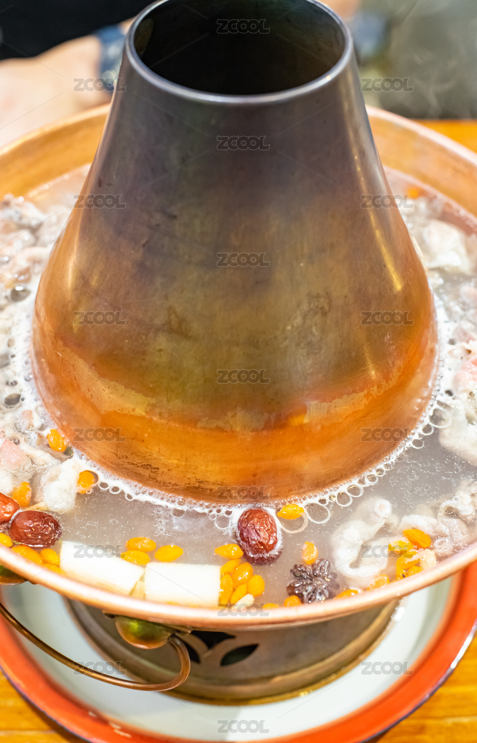 老北京銅鍋鍋骨頭湯里漂浮的香料和泛白羊肉