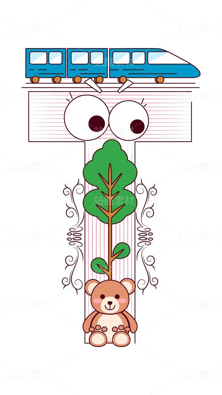 字母 T 的童趣天地:火車與小熊啟蒙插畫
