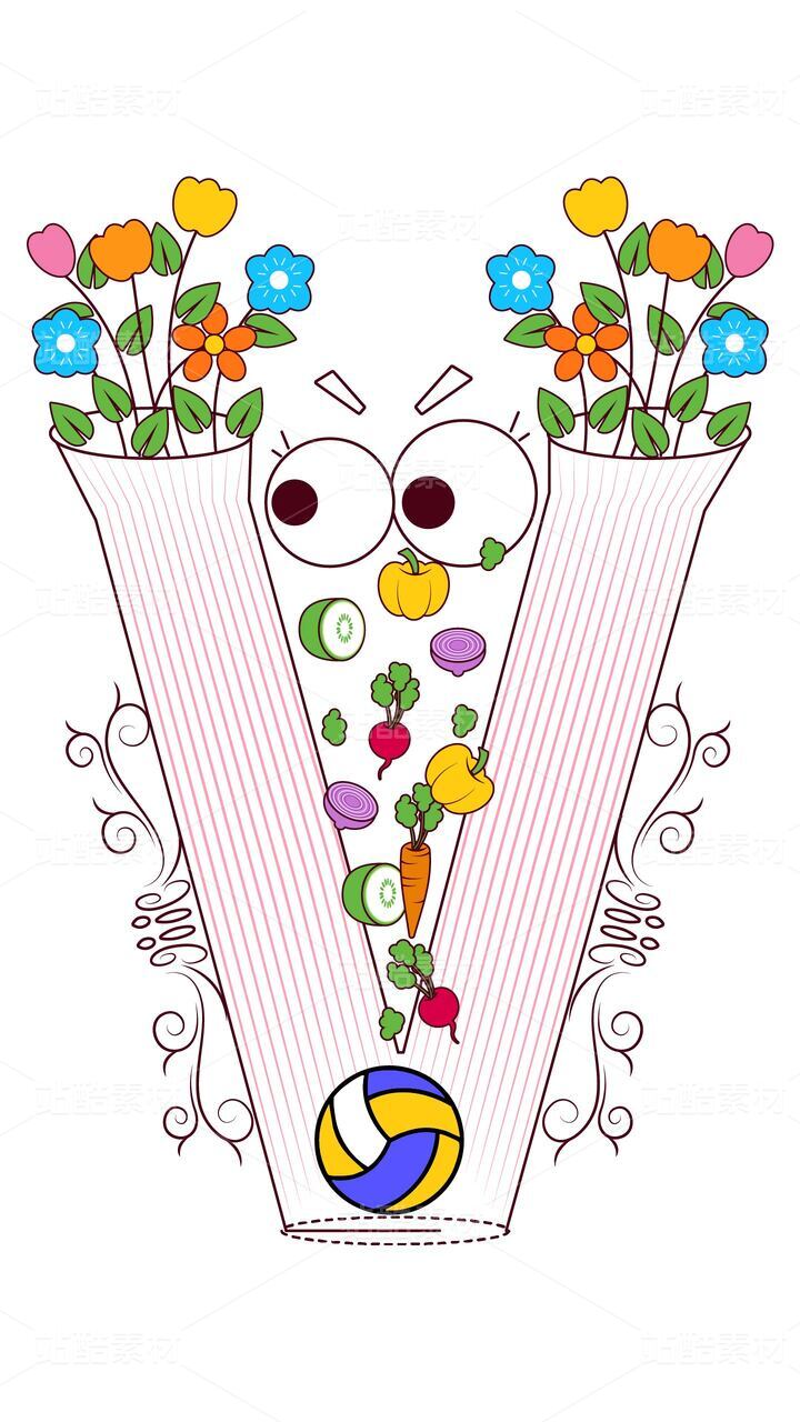 字母 V 的繽紛生活:蔬菜與排球啟蒙插畫